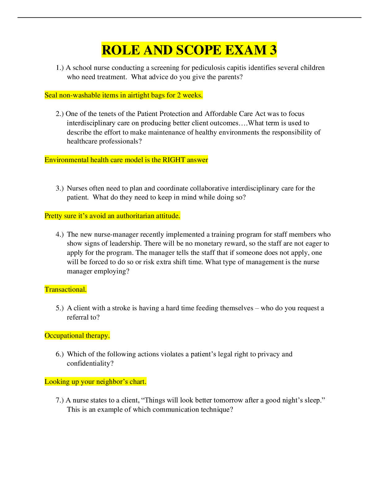 nursing care > EXAMs > ROLE AND SCOPE EXAM 3 (50 QUESTIONS AND ANSWERS) (All)