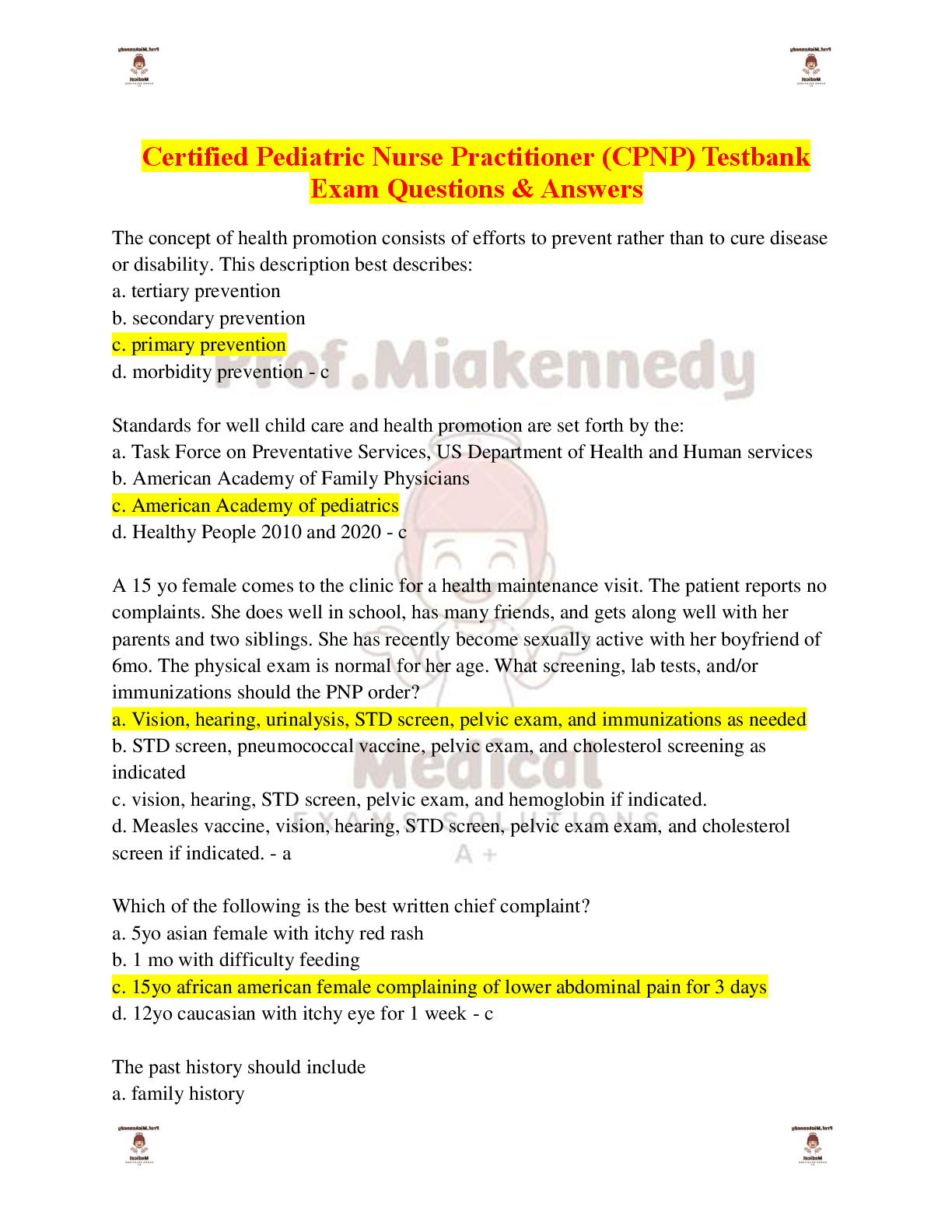 Certified Medication Aide > EXAMs > Certified Pediatric Nurse Practitioner (CPNP) Test bank Exam Questions & Answers A+ (All)