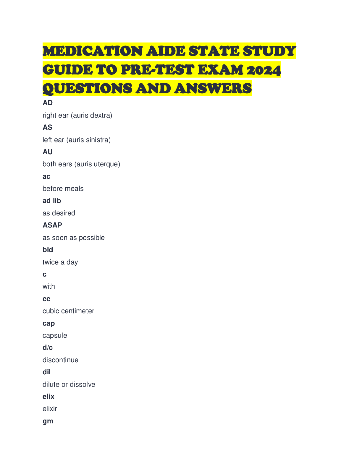 Certified Medication Aide > EXAMs > MEDICATION AIDE STATE STUDY GUIDE TO PRE-TEST EXAM 2024 QUESTIONS AND ANSWERS (All)