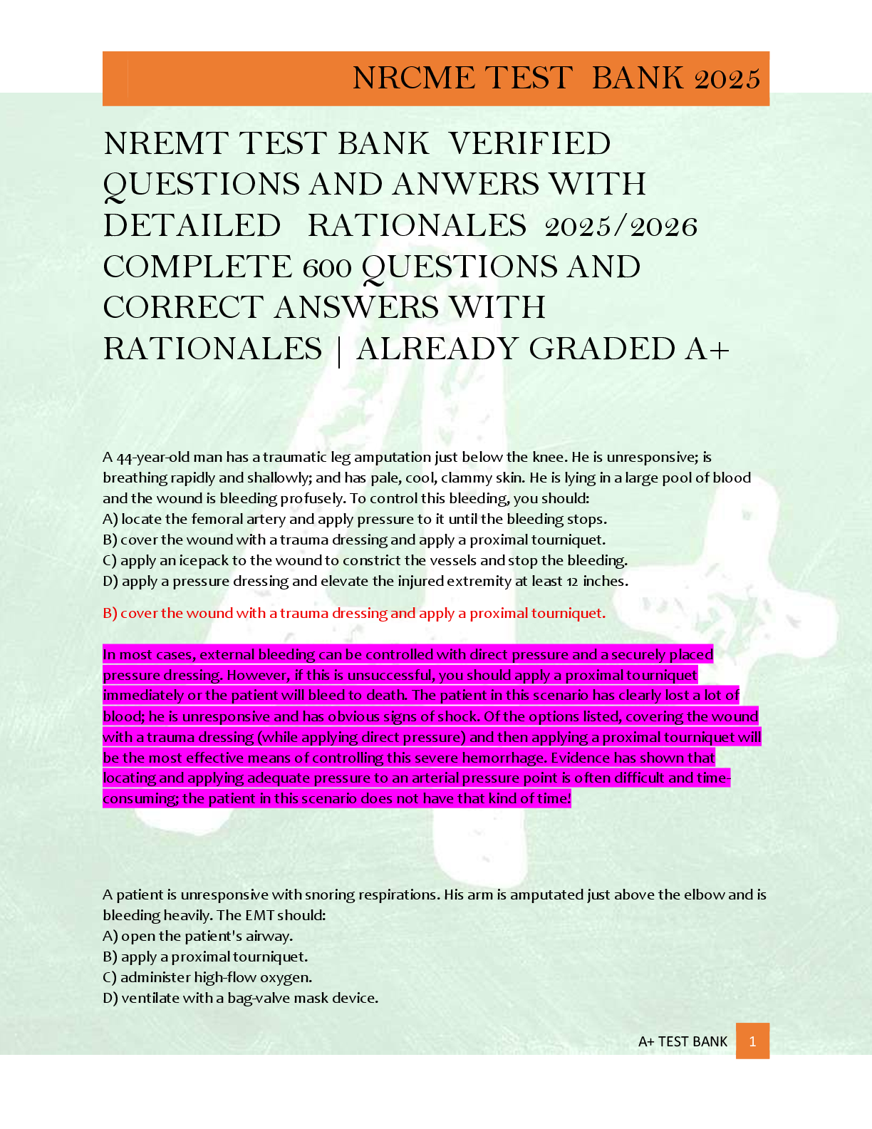Trauma Nurse Core Course (TNCC) > TEST BANKS > NREMT TEST BANK VERIFIED QUESTIONS AND ANWERS WITH DETAILED RATIONALES 2025/2026 COMPLETE 600 QUESTIONS AND CORRECT ANSWERS WITH RATIONALES | ALREADY GRADED A+ (All)