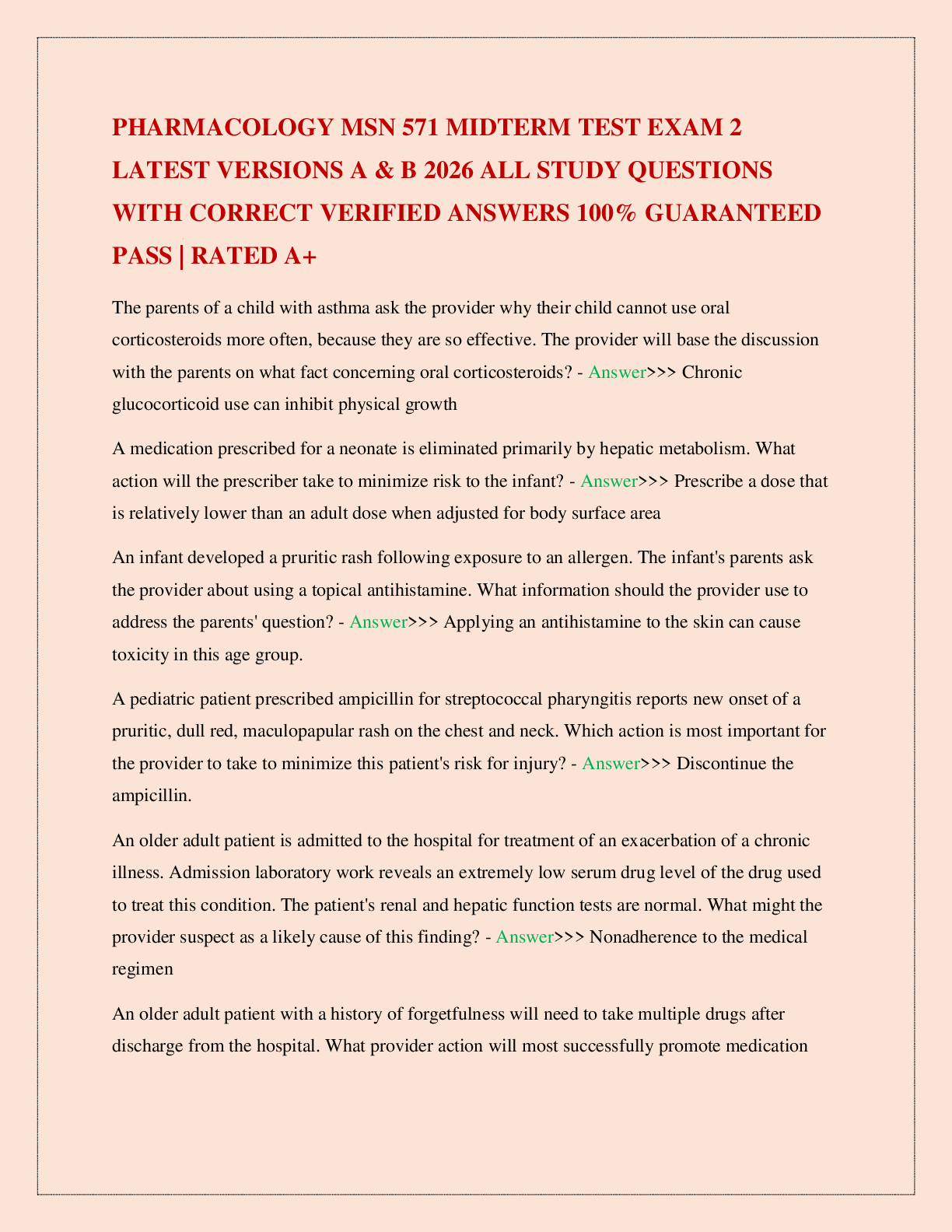 MSN 571 > EXAMs > PHARMACOLOGY MSN 571 MIDTERM TEST EXAM 2 LATEST VERSIONS A & B 2026 ALL STUDY QUESTIONS WITH CORRECT VERIFIED ANSWERS 100% GUARANTEED PASS | RATED A+ (All)
