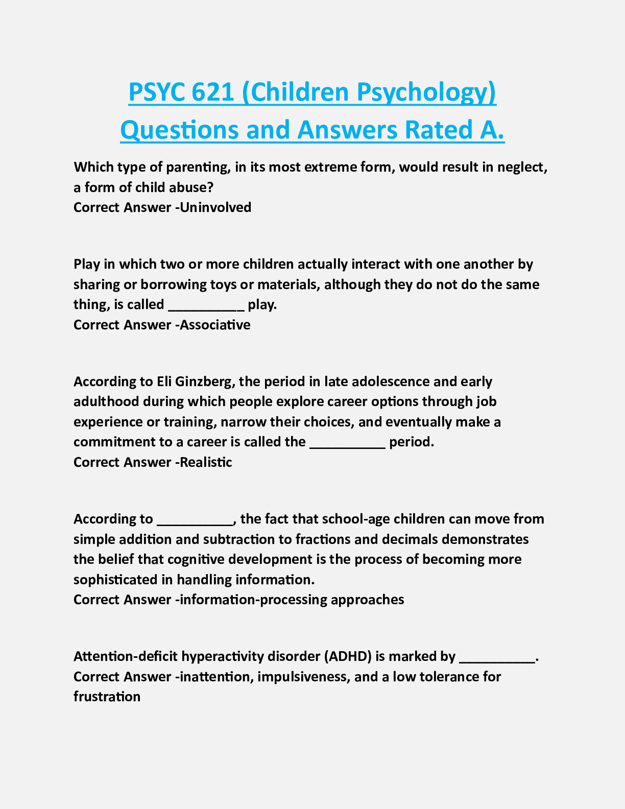 PSYC 387 > EXAM > PSYC 621 (Children Psychology) Questions and Answers Rated A (All)