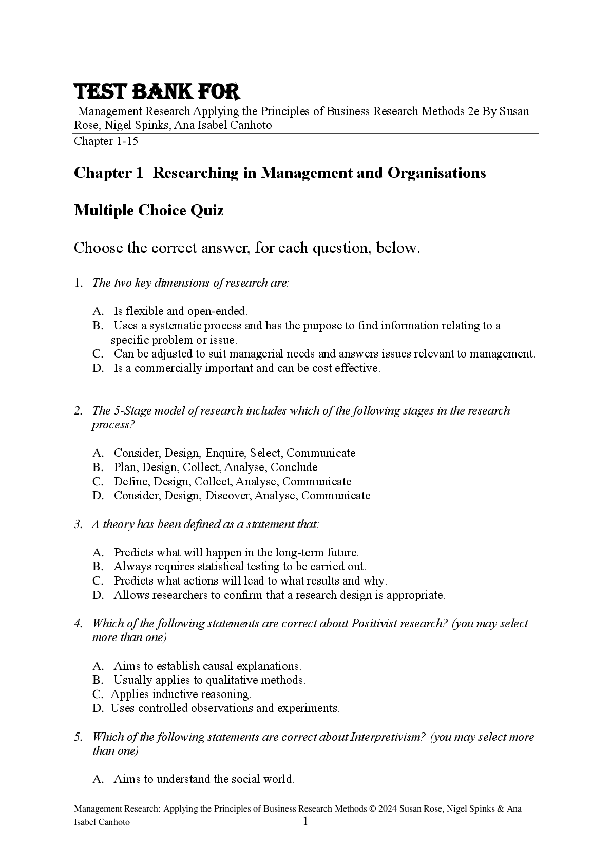 BUSI 352 > TEST BANKS > Test Bank For Management Research Applying the Principles of Business Research Methods 2nd Edition By Susan Rose, Nigel Spinks, Ana Isabel Canhoto (All)