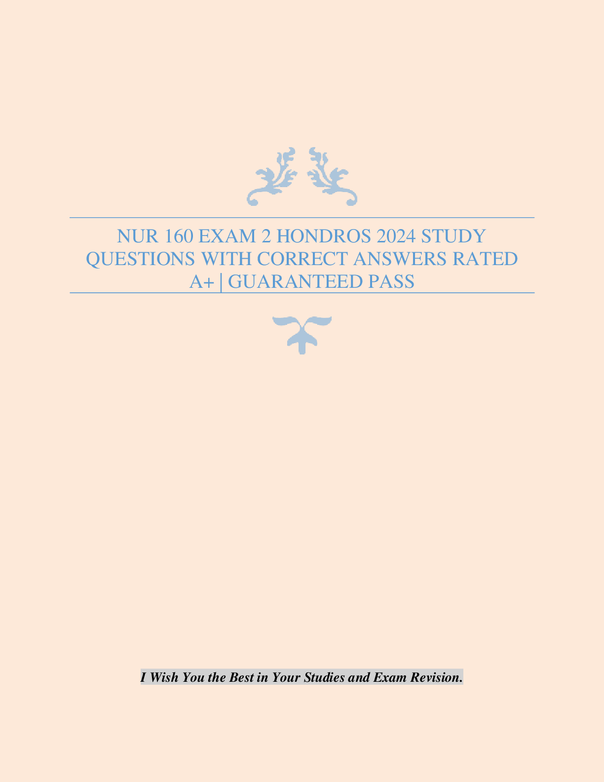 NUR 155 > EXAMs > NUR 160 EXAM 2 HONDROS 2024 STUDY QUESTIONS WITH CORRECT ANSWERS RATED A+ | GUARANTEED PASS (All)