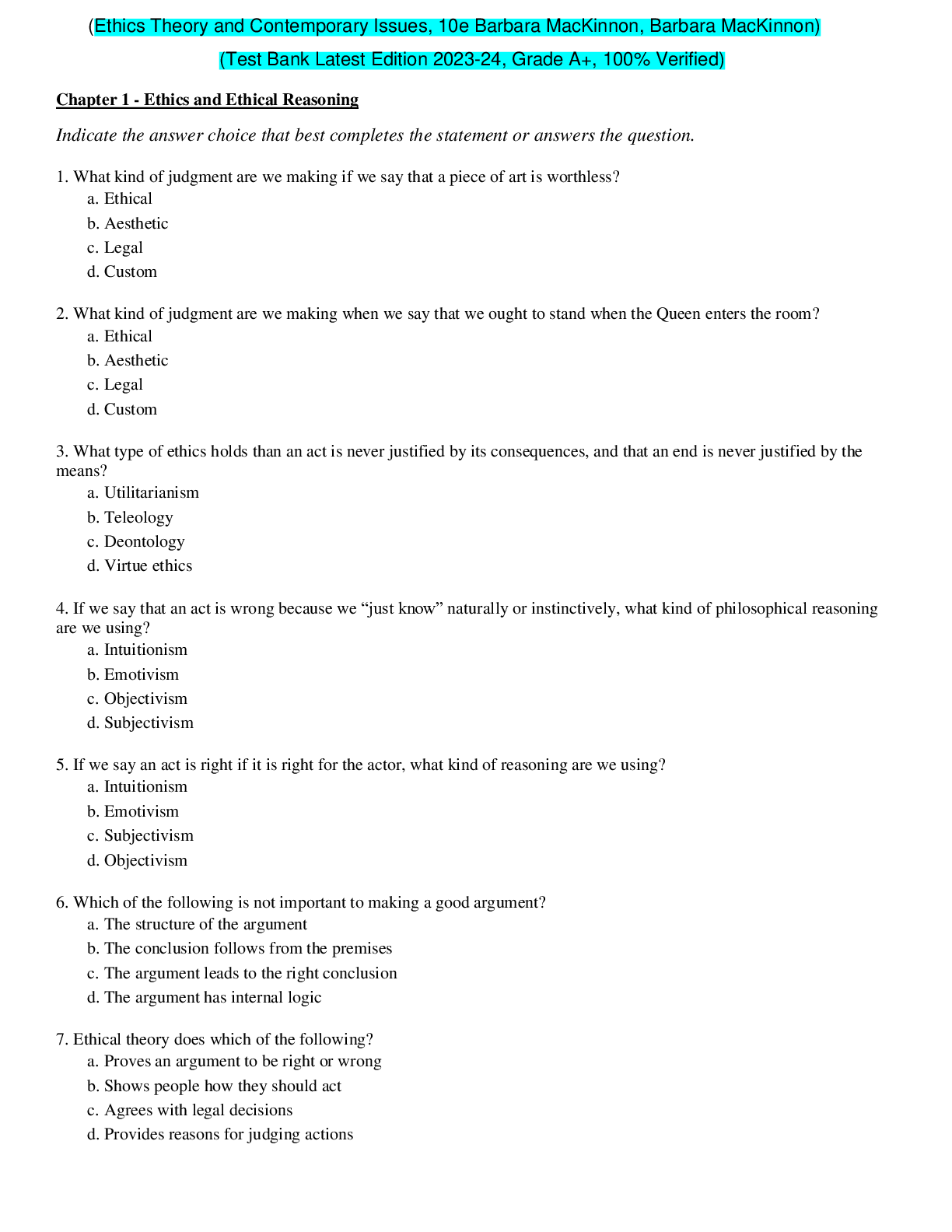 Social Sciences > TEST BANKS > Ethics Theory and Contemporary Issues, 10e Barbara MacKinnon, Barbara MacKinnon (Test Bank Latest Edition 2023-24, Grade A+, 100% Verified) (All)