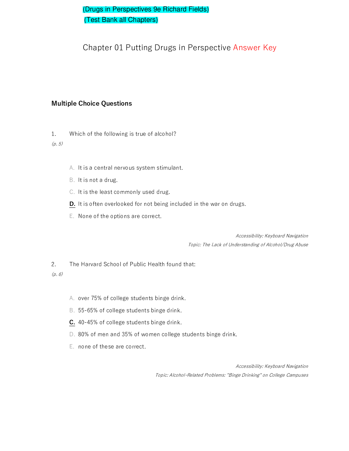 Social Sciences > TEST BANKS > Drugs in Perspectives 9e Richard Fields (Test Bank) (All)