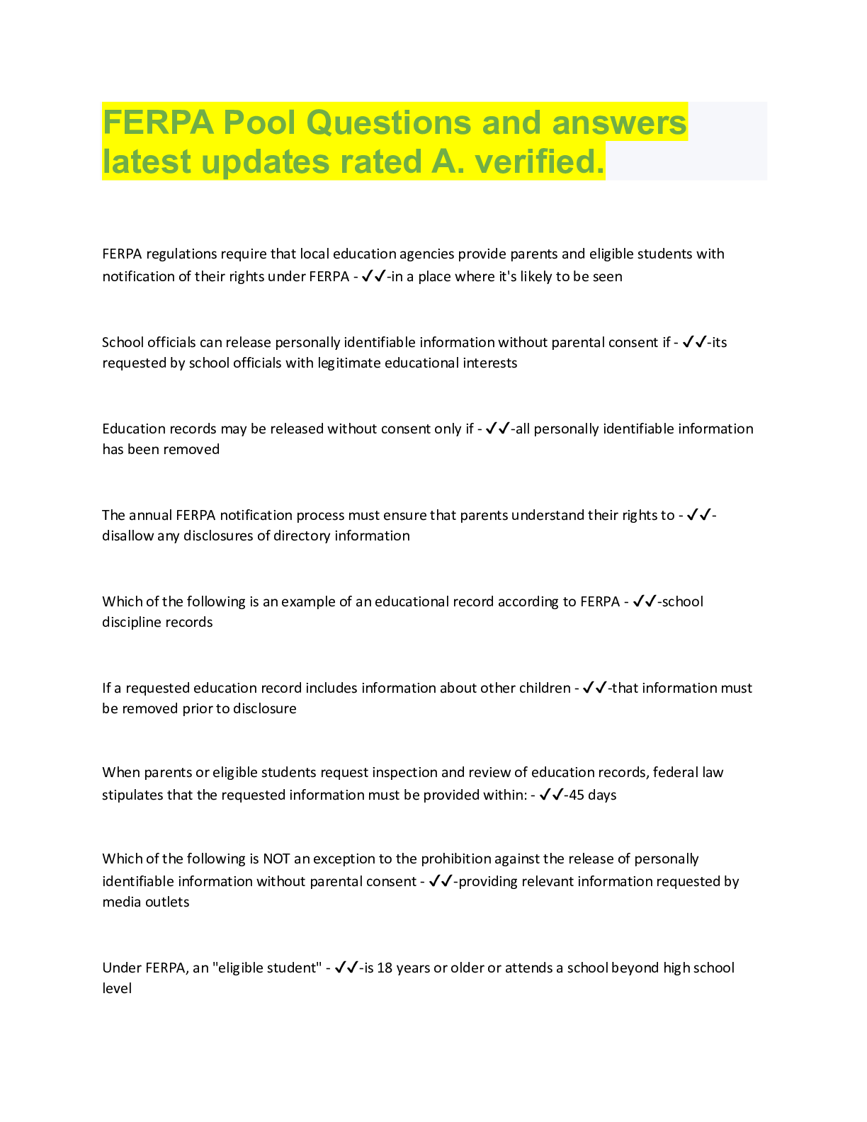Social Sciences > QUESTIONS & ANSWERS > FERPA Pool Questions and answers latest updates rated A. verified. (All)