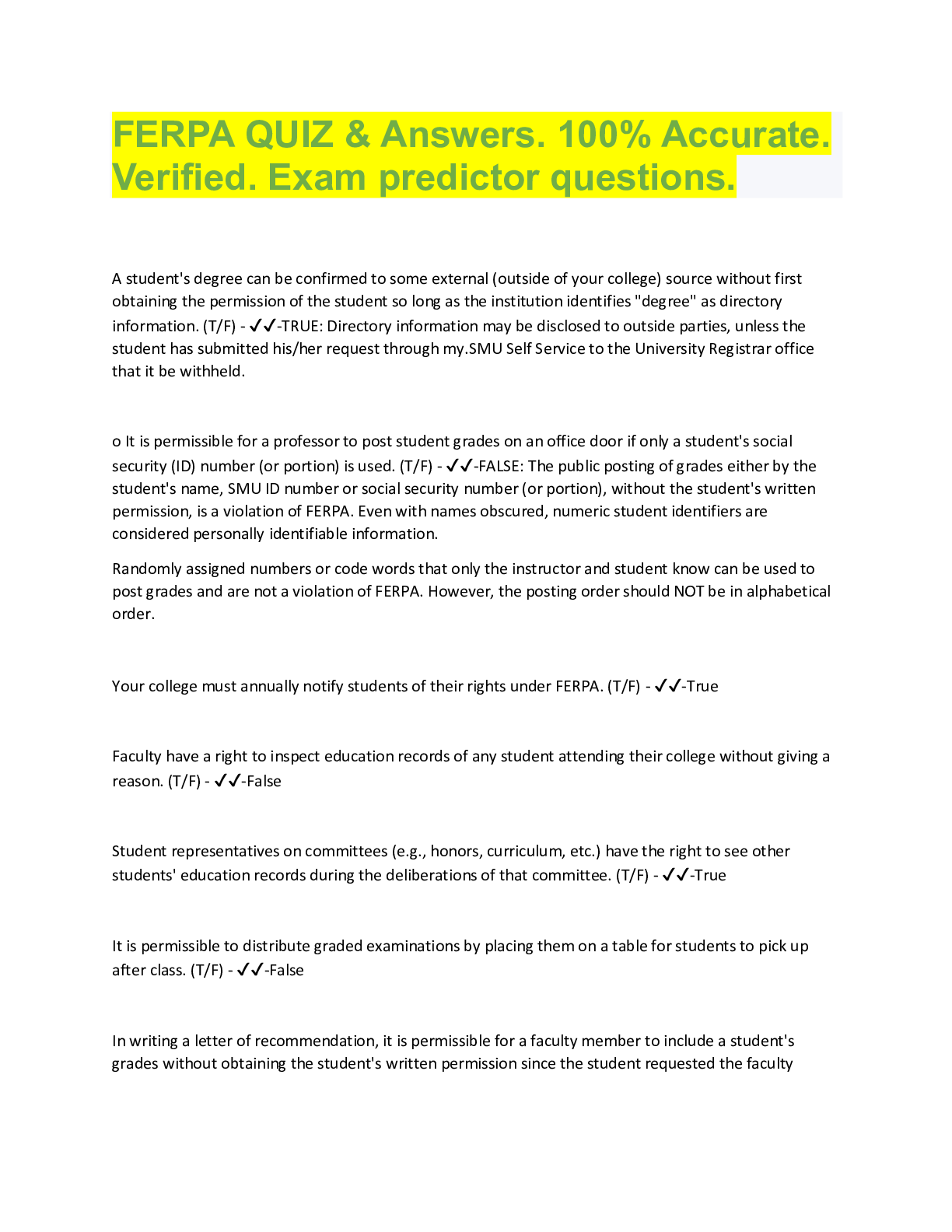 Social Sciences > QUESTIONS & ANSWERS > FERPA QUIZ & Answers. 100% Accurate. Verified. Exam predictor questions. (All)