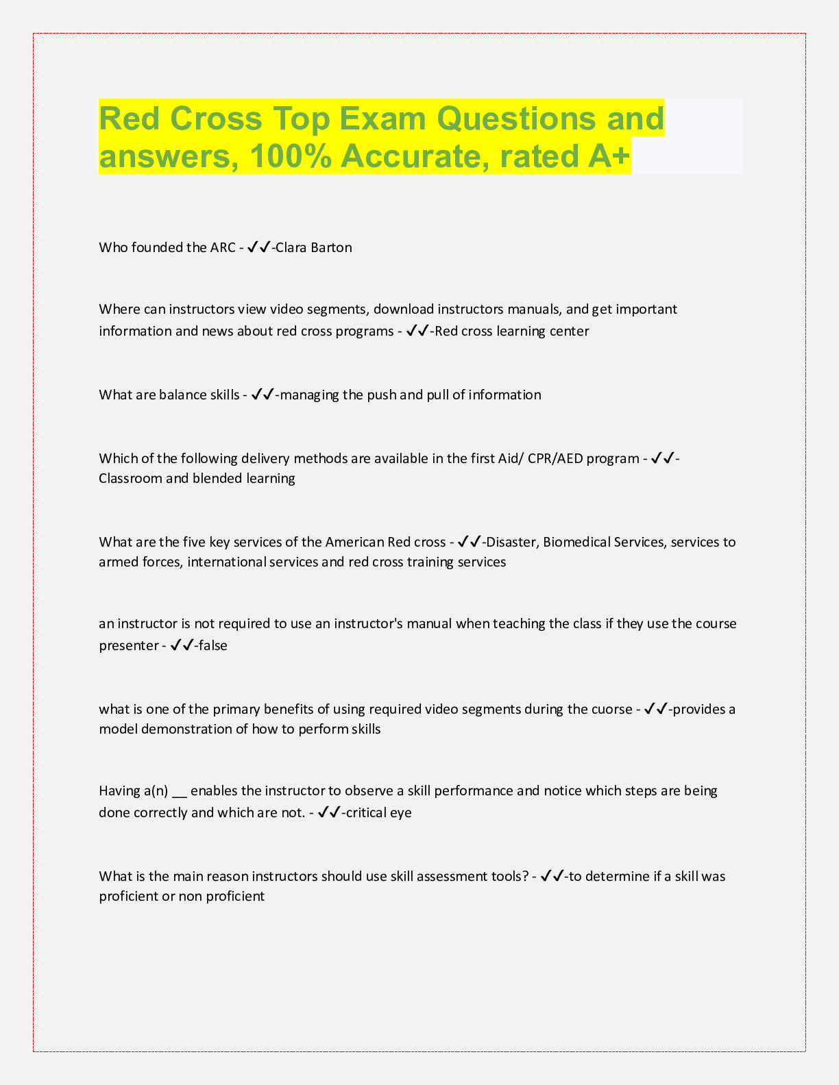 Social Sciences > QUESTIONS & ANSWERS > Red Cross Top Exam Questions and answers, 100% Accurate, rated A+ Who founded the ARC - ✔✔-Clara B (All)