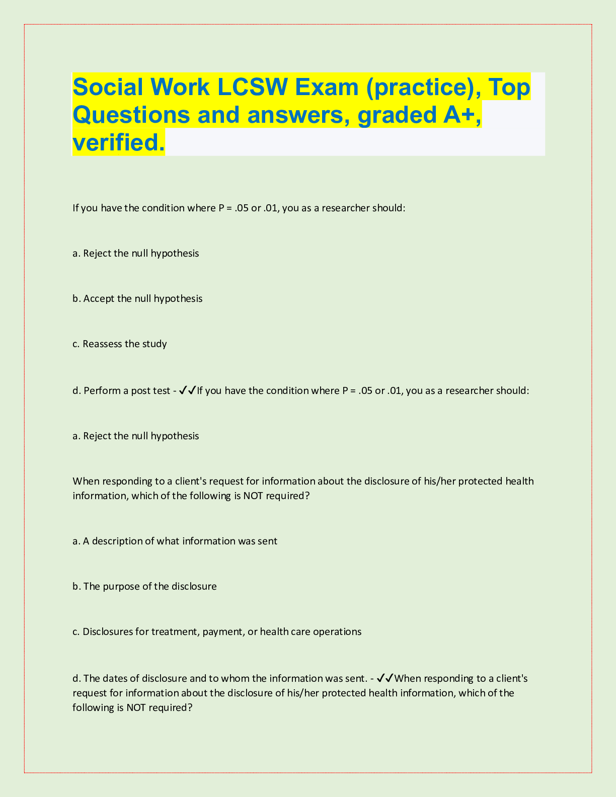 Social Sciences > QUESTIONS & ANSWERS > Sample LCSW test questions & Answers. 100% Accurate. Rated A+ (All)
