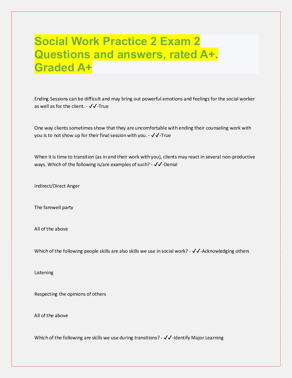 Social Sciences > QUESTIONS & ANSWERS > Social Work Practice 2 Exam 2 Questions and answers, rated A+. Graded A+ Ending Sessions (All)