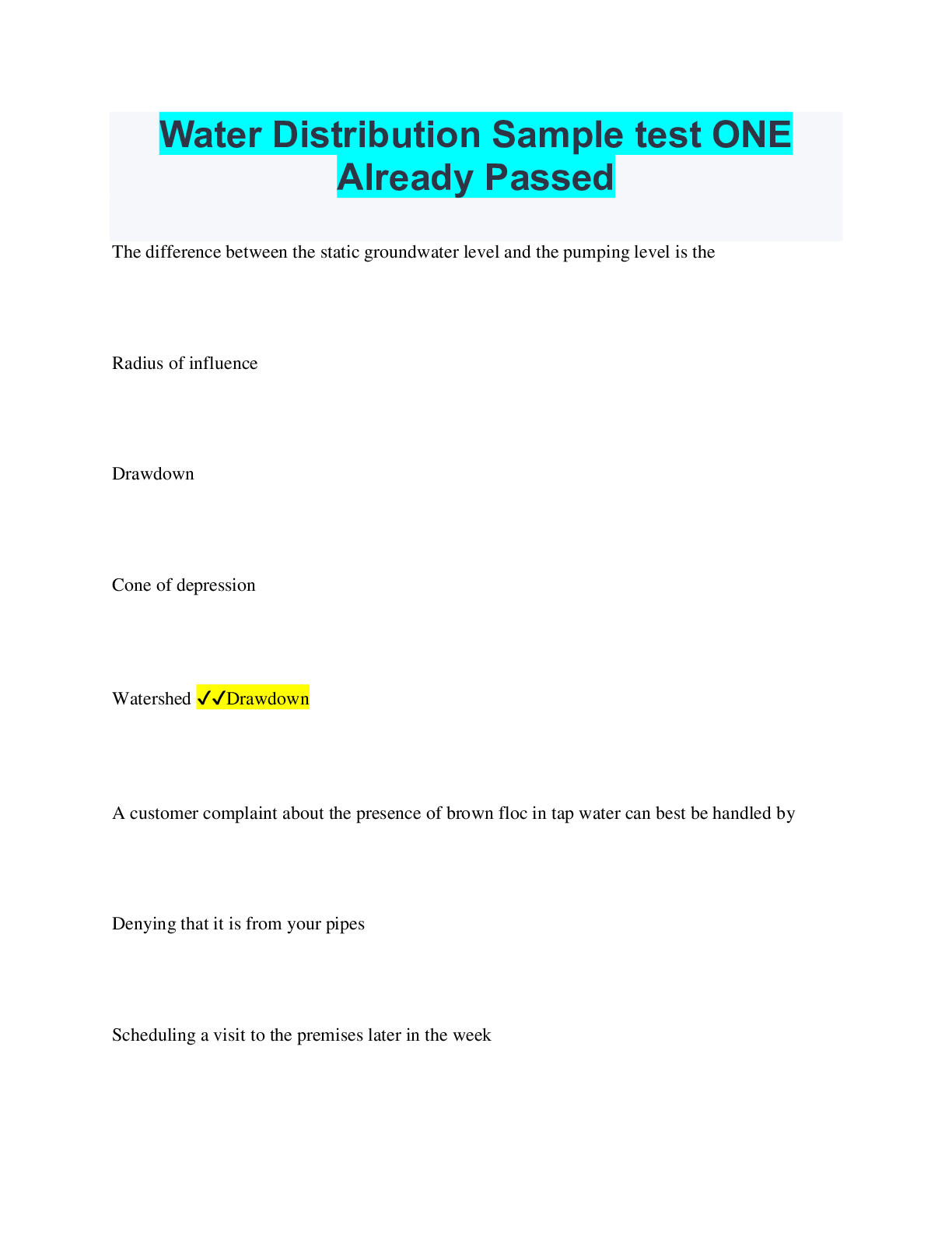 Social Sciences > QUESTIONS & ANSWERS > Water Distribution Sample test ONE Already Passed (All)