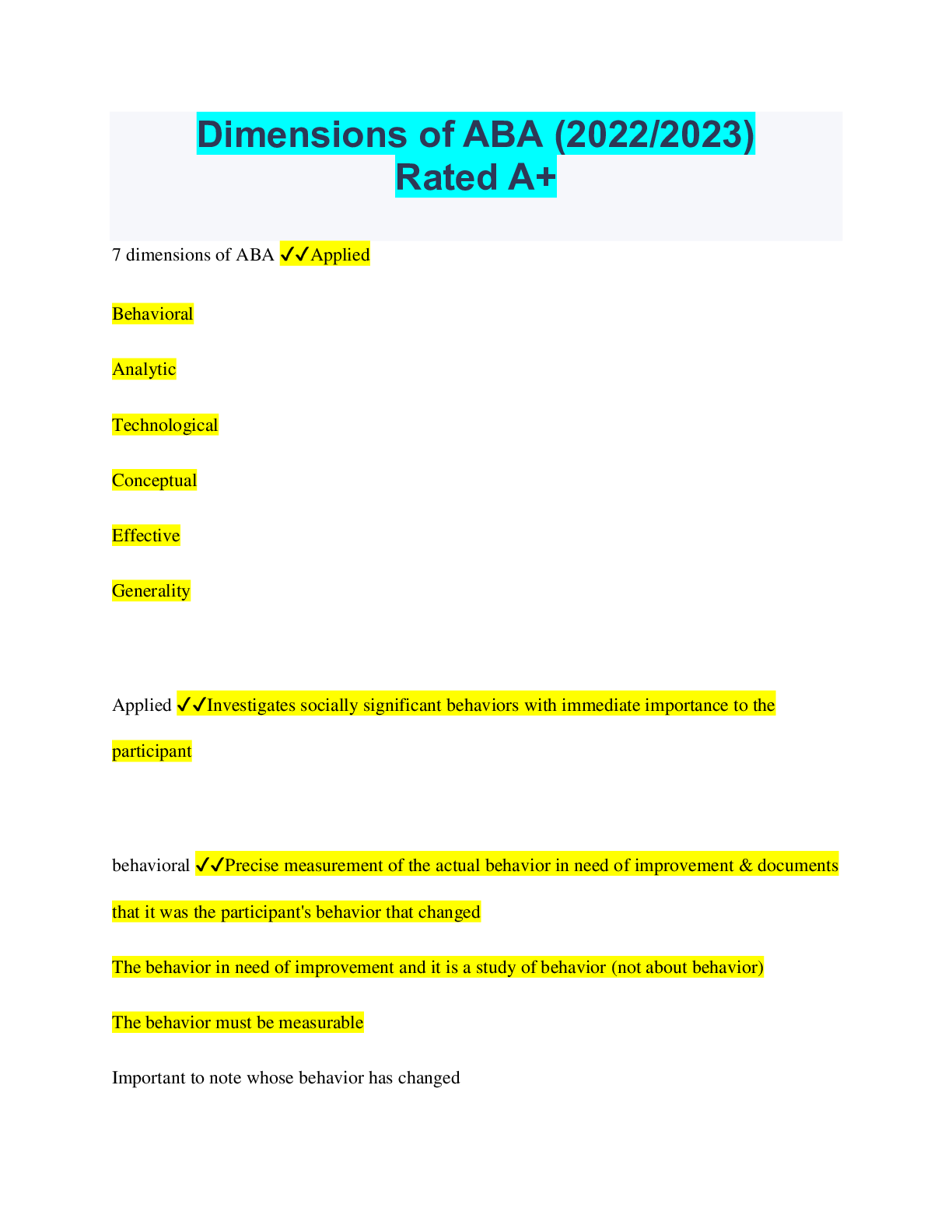 Social Sciences > QUESTIONS & ANSWERS > Dimensions of ABA (2022/2023) Rated A+ (All)