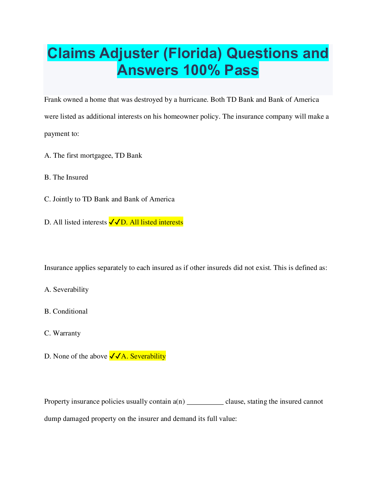 Social Sciences > QUESTIONS & ANSWERS > Claims Adjuster (Florida) Questions and Answers 100% Pass (All)