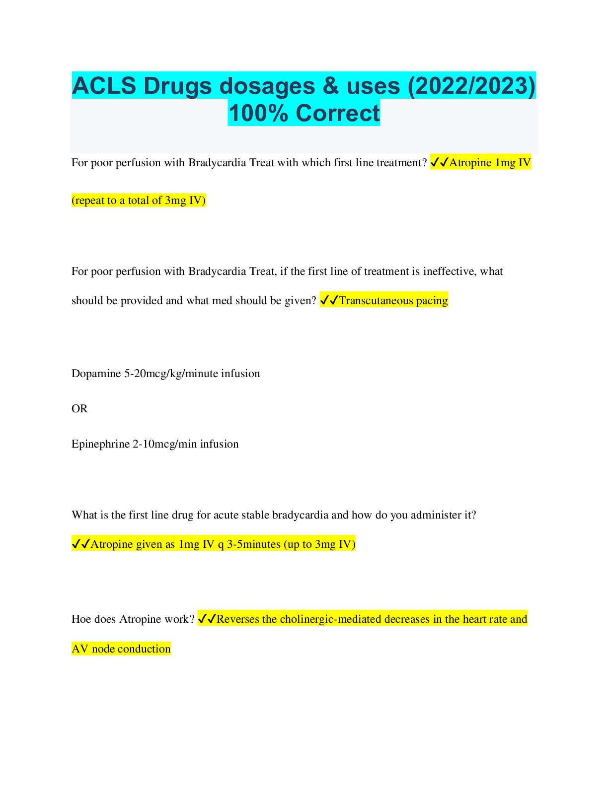 Social Sciences > QUESTIONS & ANSWERS > ACLS Drugs dosages & uses (2022/2023) 100% Correct (All)