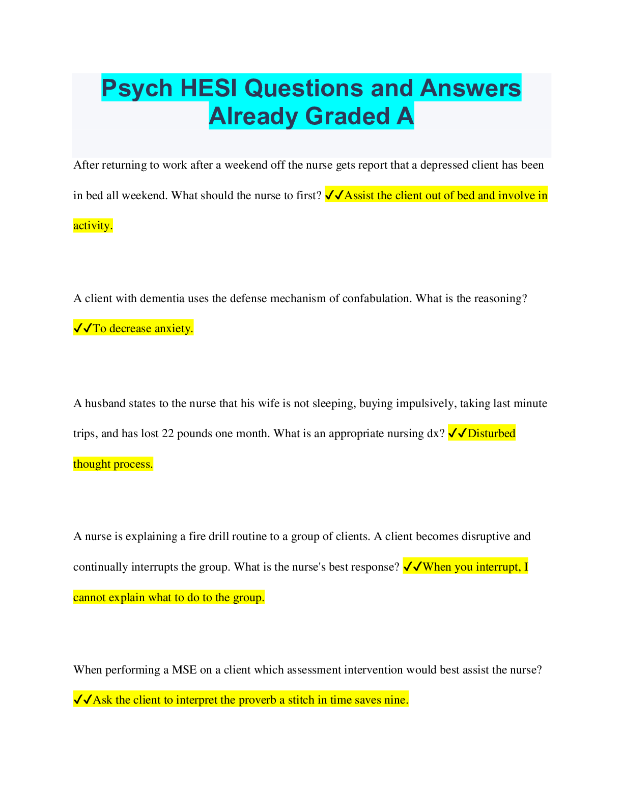 Social Sciences > QUESTIONS & ANSWERS > Psych HESI Questions and Answers Already Graded A (All)