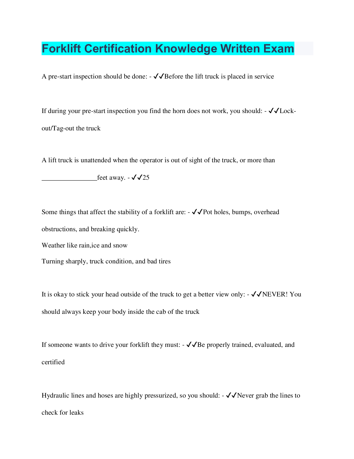Social Sciences > QUESTIONS & ANSWERS > Forklift Certification Knowledge Written Exam (All)