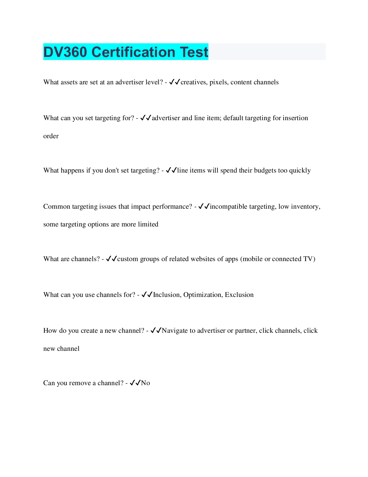 Social Sciences > QUESTIONS & ANSWERS > DV360 Certification Test (All)