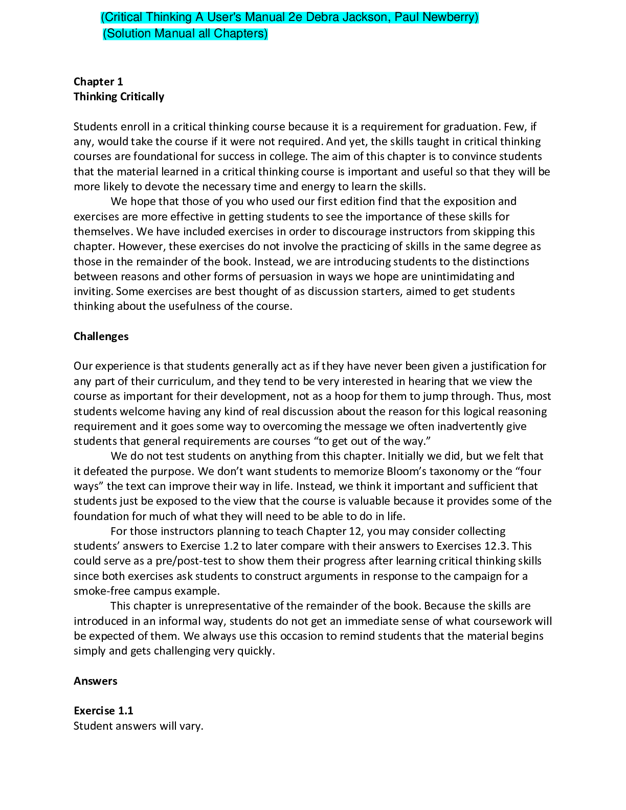 Social Sciences > SOLUTIONS MANUAL > Critical Thinking A User's Manual 2e Debra Jackson, Paul Newberry (Solution Manual) (All)