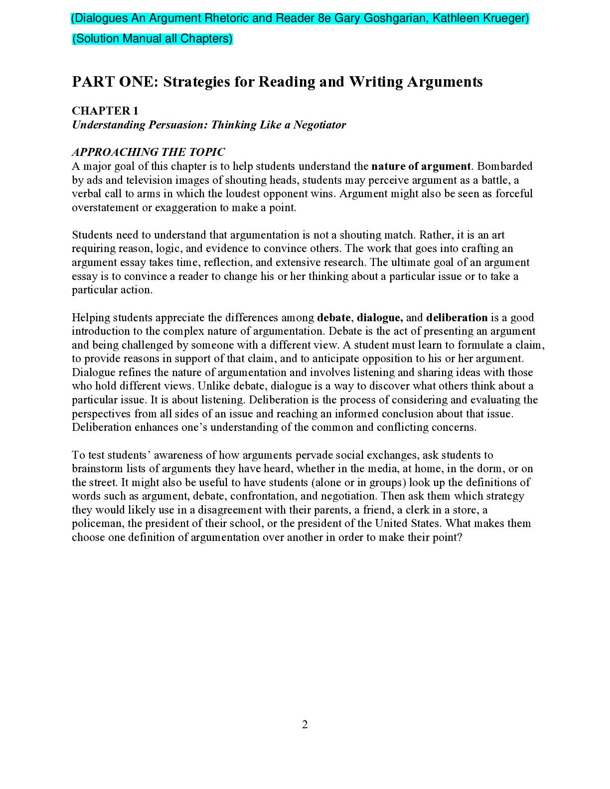 Social Sciences > SOLUTIONS MANUAL > Dialogues An Argument Rhetoric and Reader 8e Gary Goshgarian, Kathleen Krueger (Solution Manual) (All)