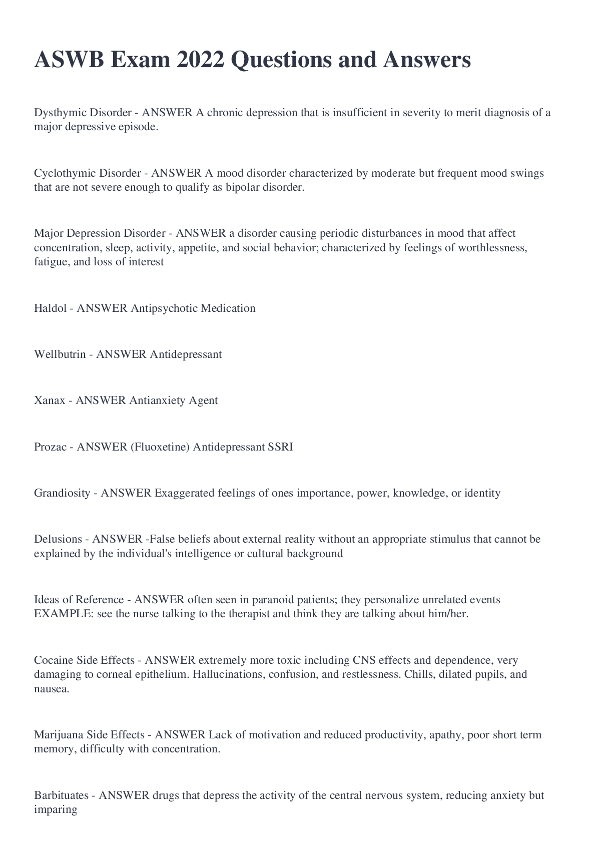 Social Sciences > EXAM > ASWB Exam 2022 Questions and Answers (All)