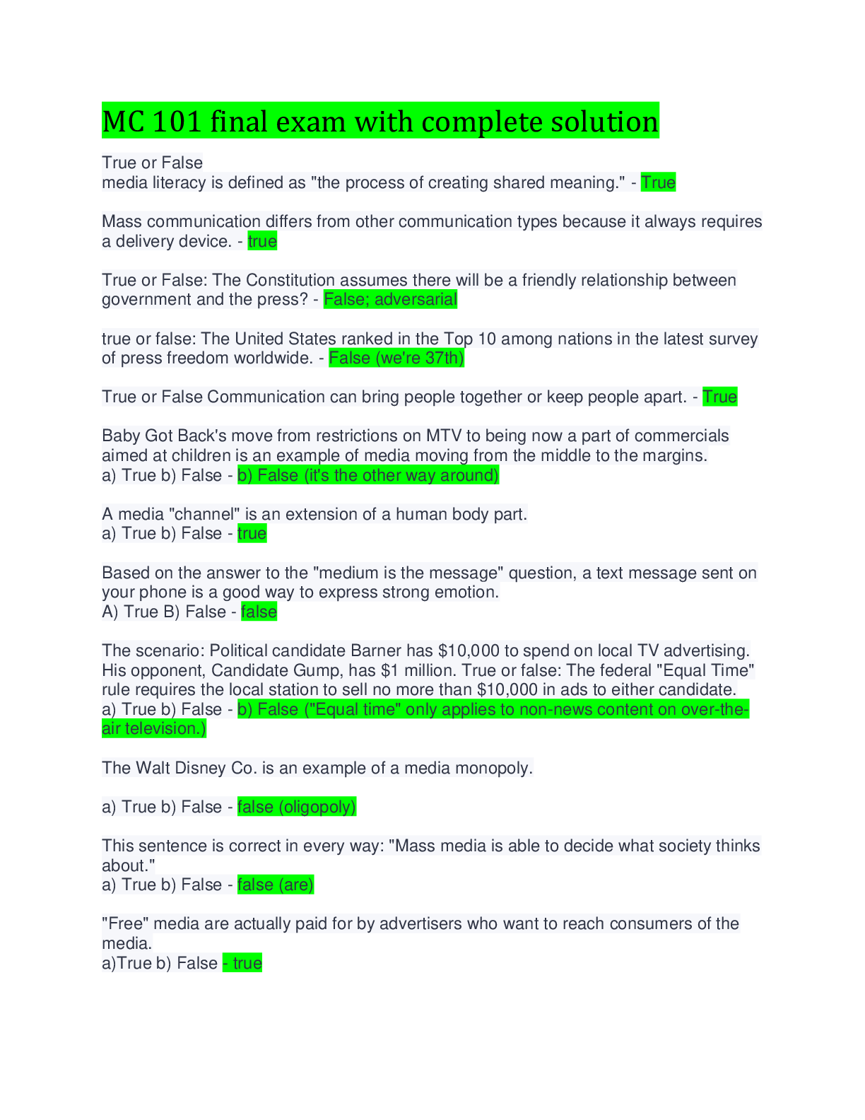 Social Sciences > QUESTIONS & ANSWERS > MC 101 final exam with complete solution (All)