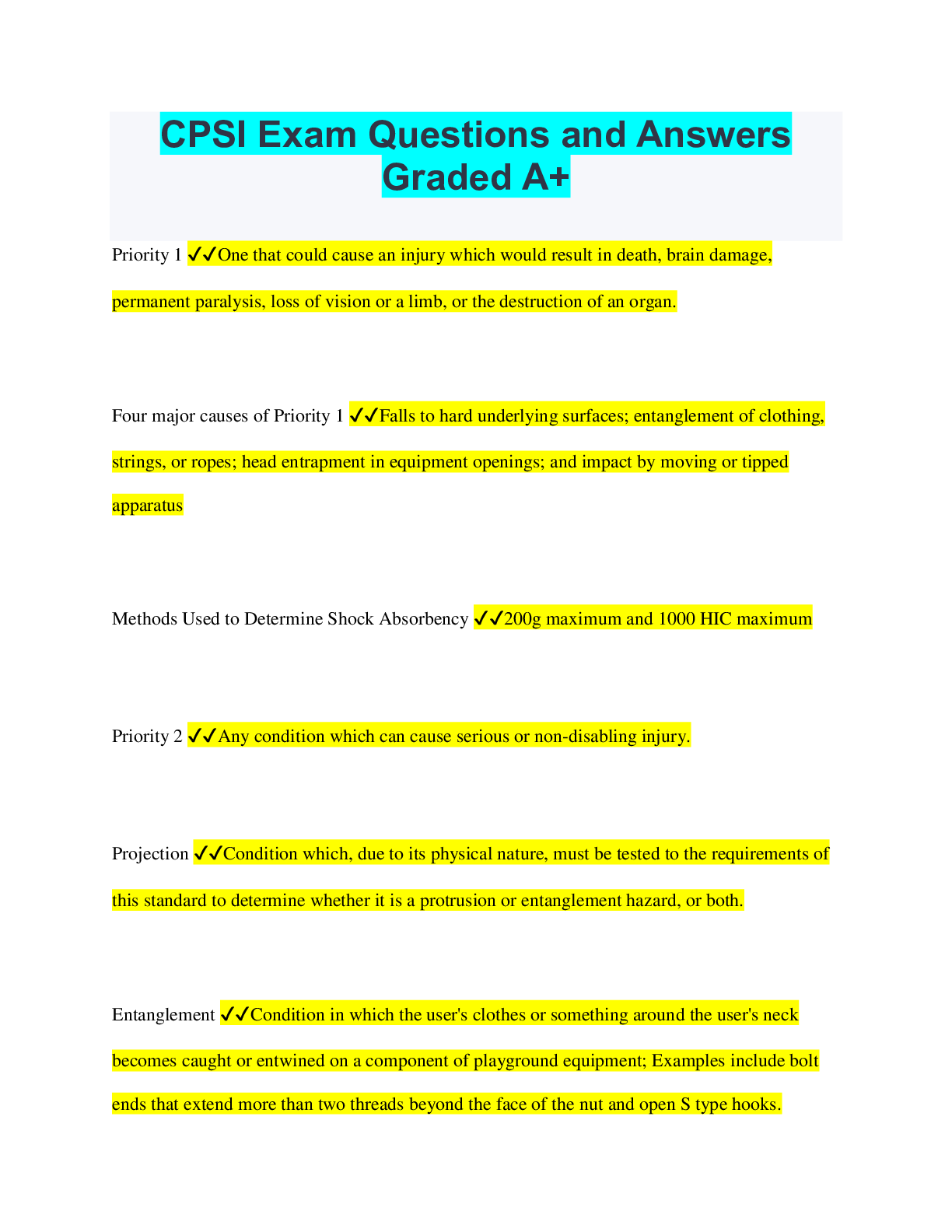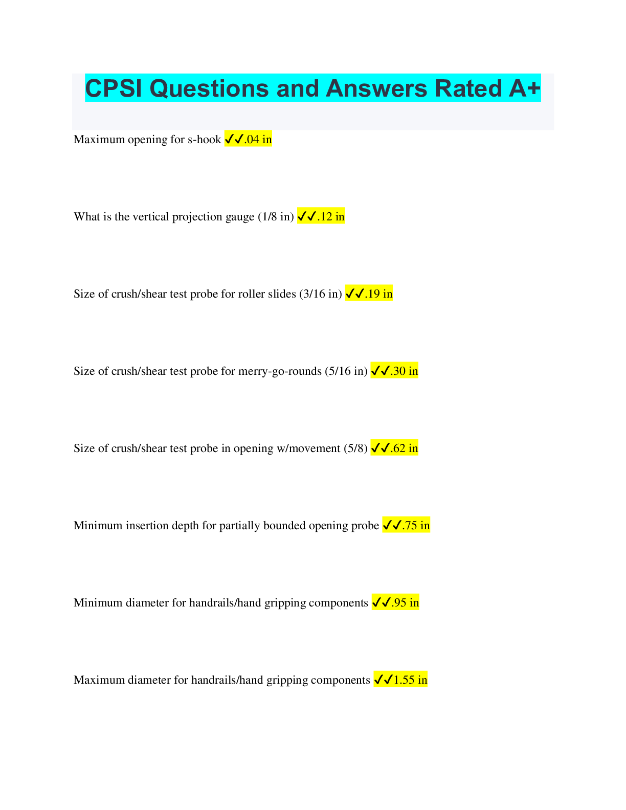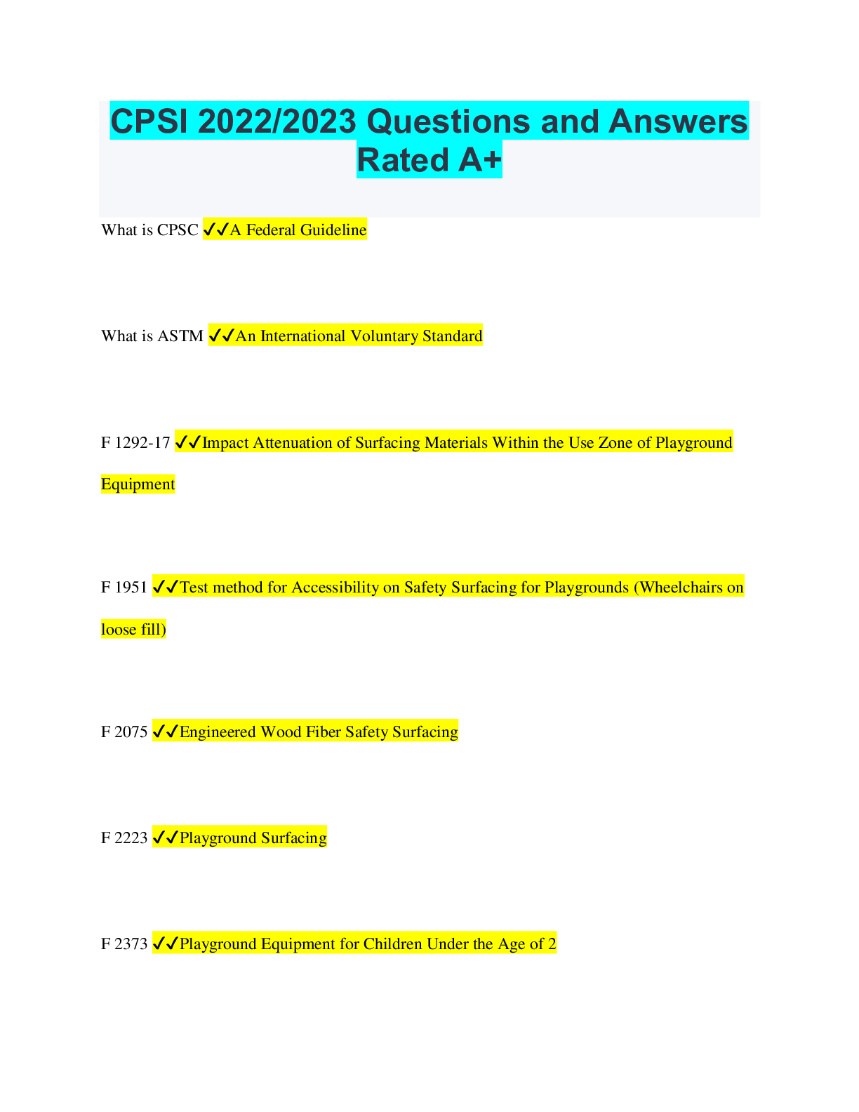 Social Sciences > QUESTIONS & ANSWERS > Certified Playground Safety Inspector CPSI Sample Exam Questions Already Passed (All)
