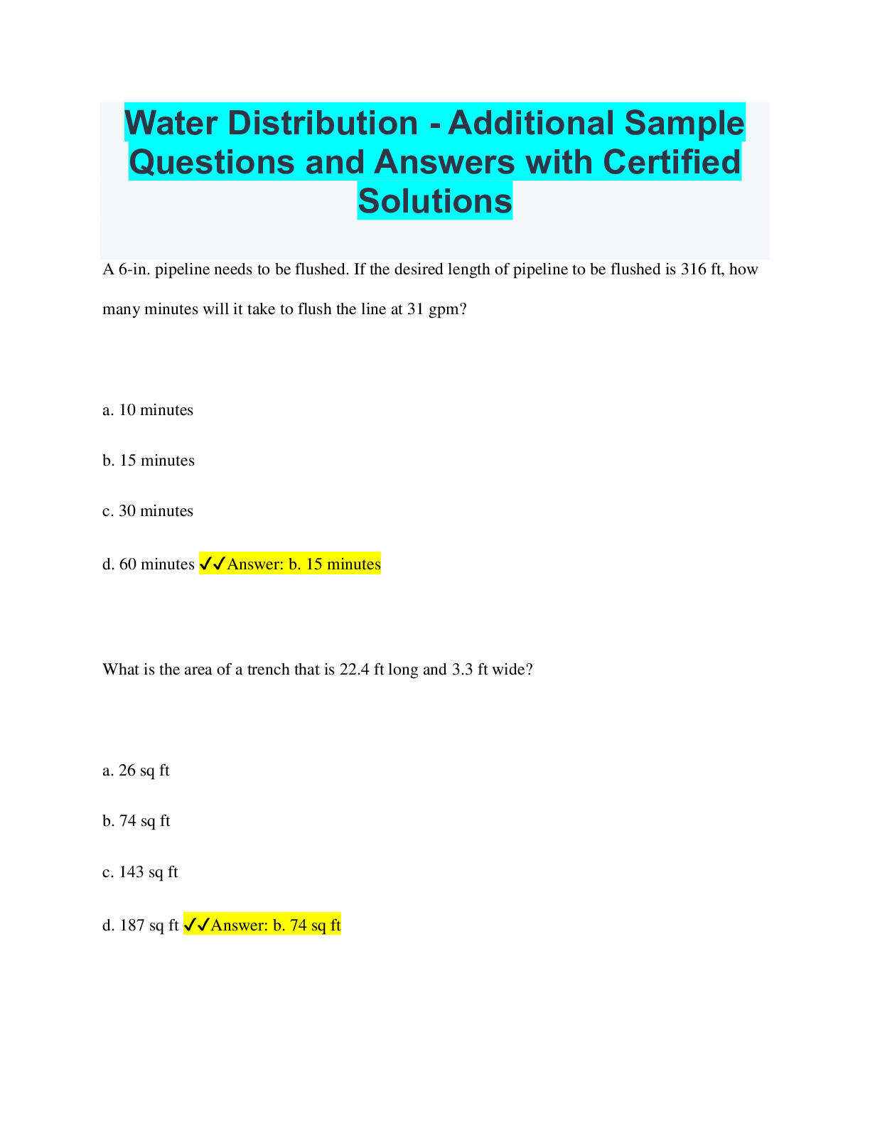 Social Sciences > QUESTIONS & ANSWERS > Water Distribution - Additional Sample Questions and Answers with Certified Solutions (All)