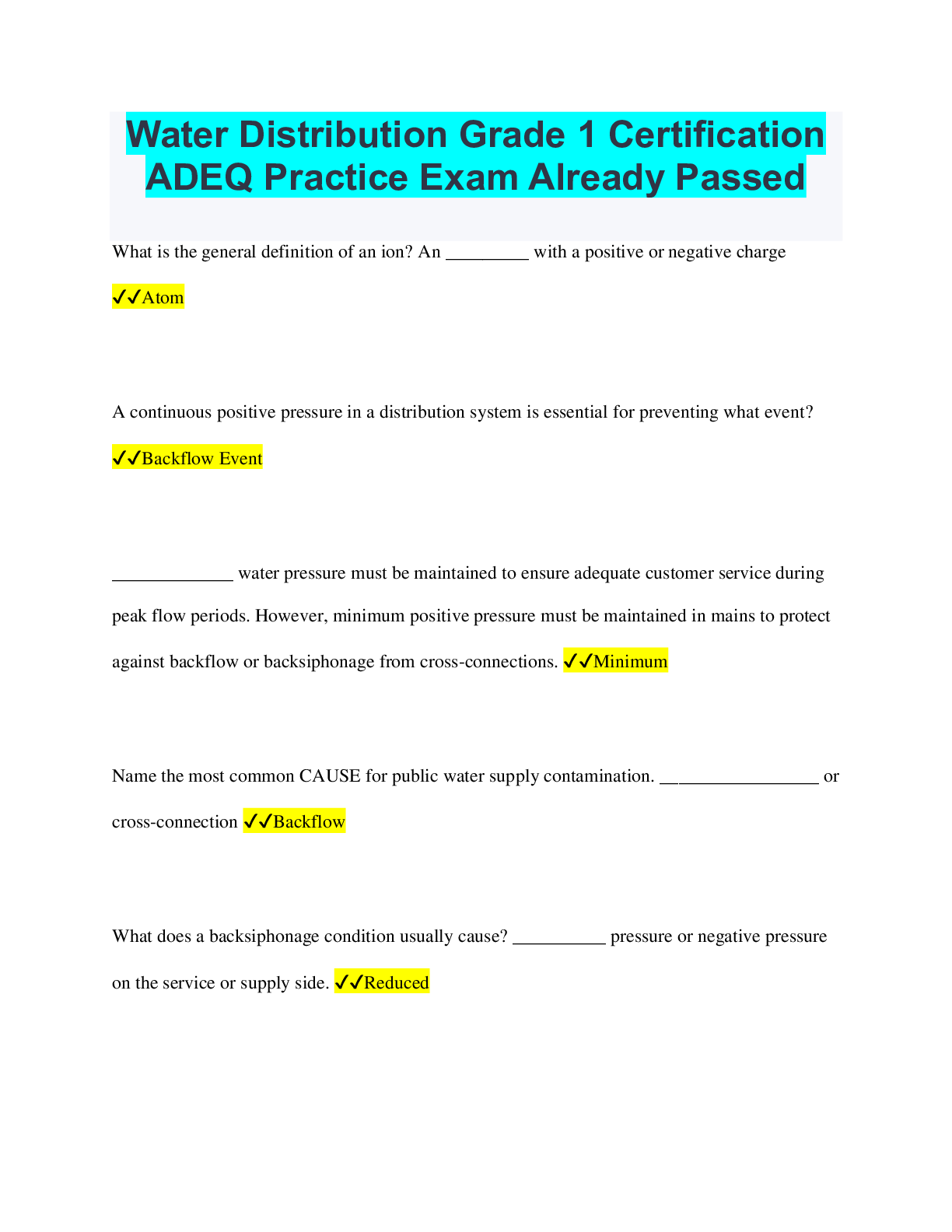 Social Sciences > QUESTIONS & ANSWERS > Water Distribution Grade 1 Certification ADEQ Practice Exam Already Passed (All)