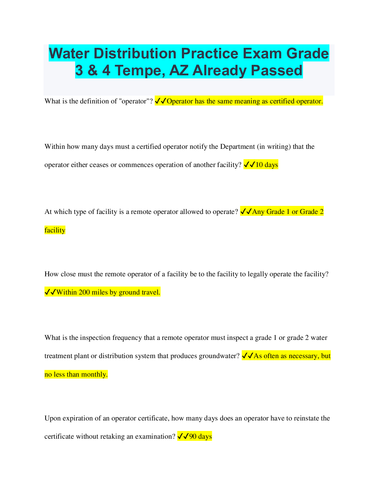 Social Sciences > QUESTIONS & ANSWERS > Water Distribution Practice Exam Grade 3 & 4 Tempe, AZ Already Passed (All)