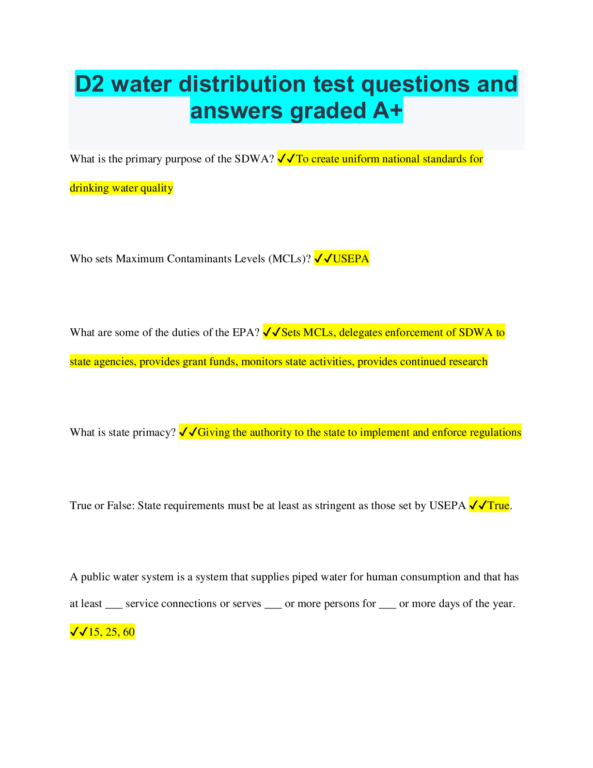 Social Sciences > QUESTIONS & ANSWERS > D2 water distribution test questions and answers graded A+ (All)