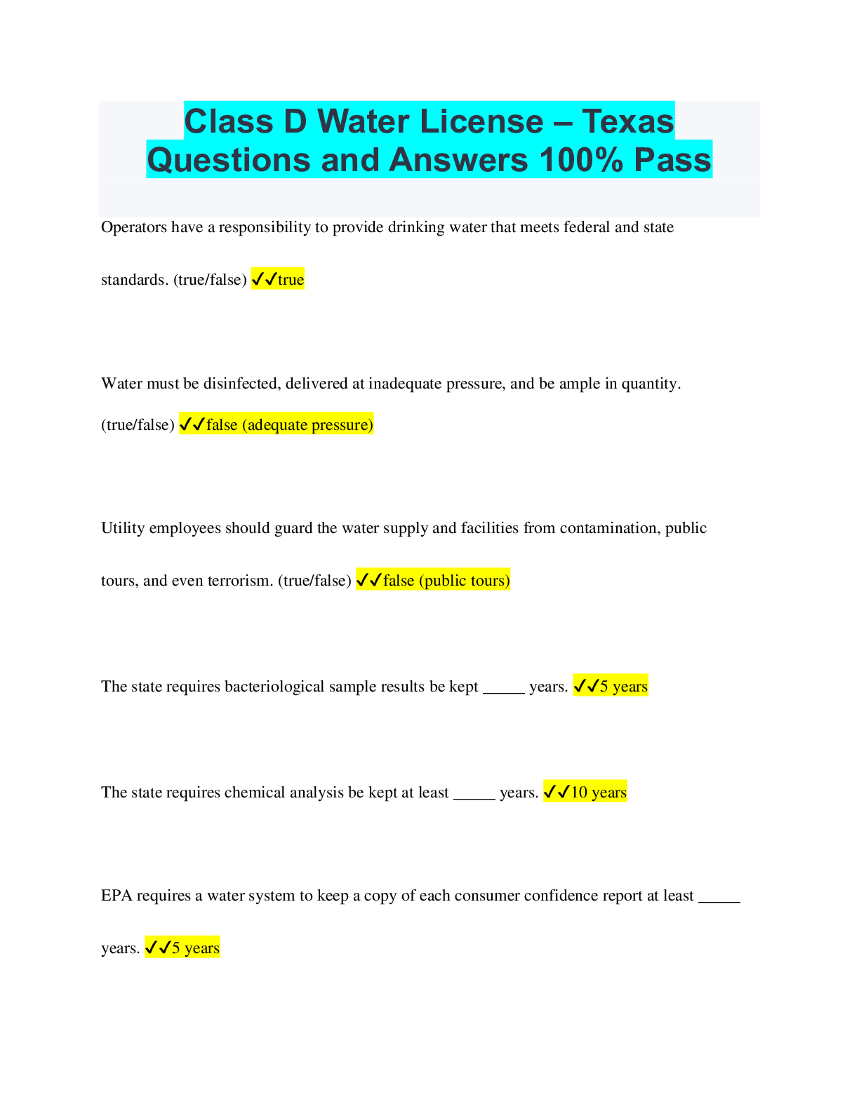 Social Sciences > QUESTIONS & ANSWERS > Class D Water License – Texas Questions and Answers 100% Pass (All)