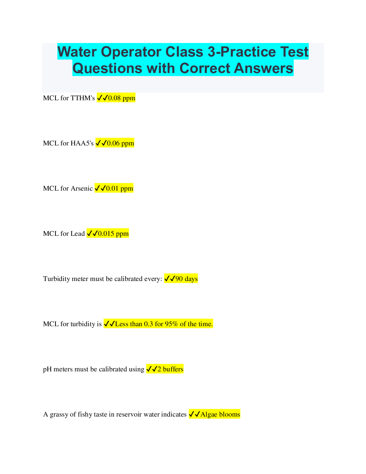Social Sciences > QUESTIONS & ANSWERS > Water Operator Class 3-Practice Test Questions with Correct Answers (All)