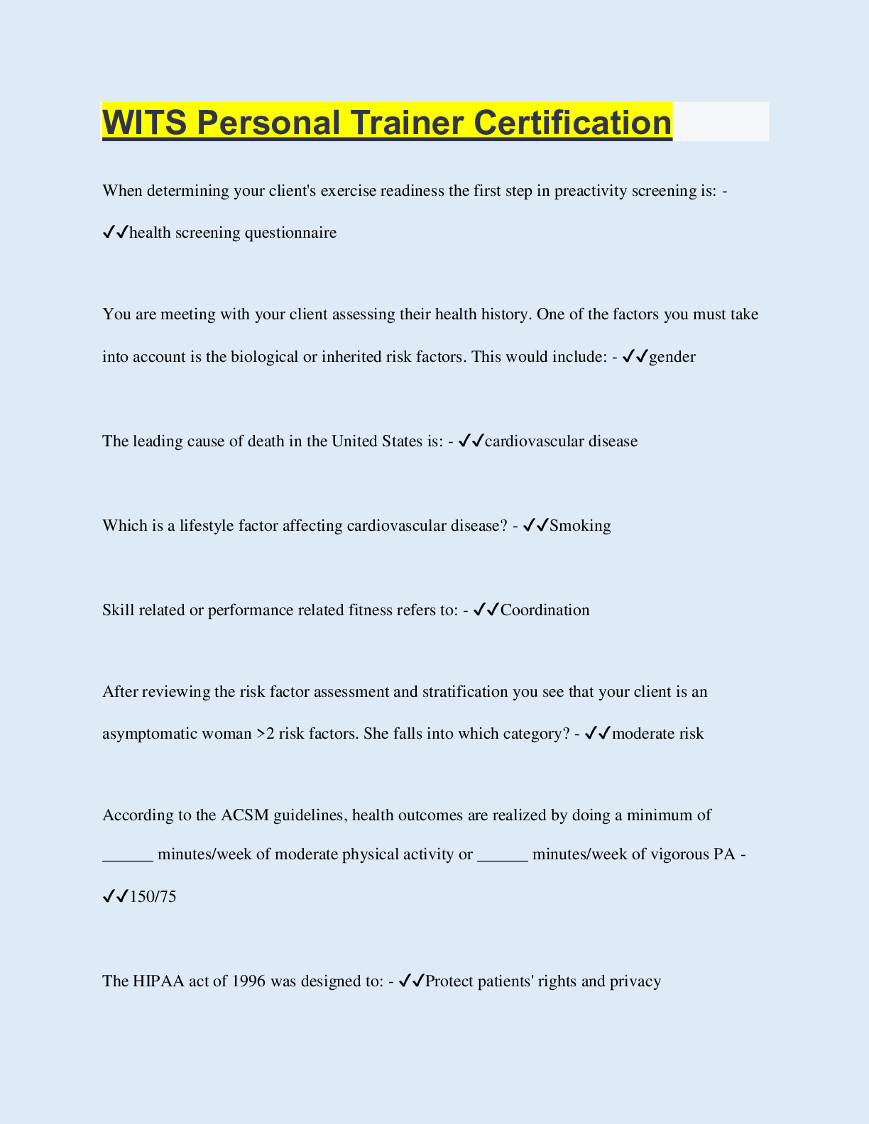 Social Sciences > QUESTIONS & ANSWERS > WITS Personal Trainer Certification (All)