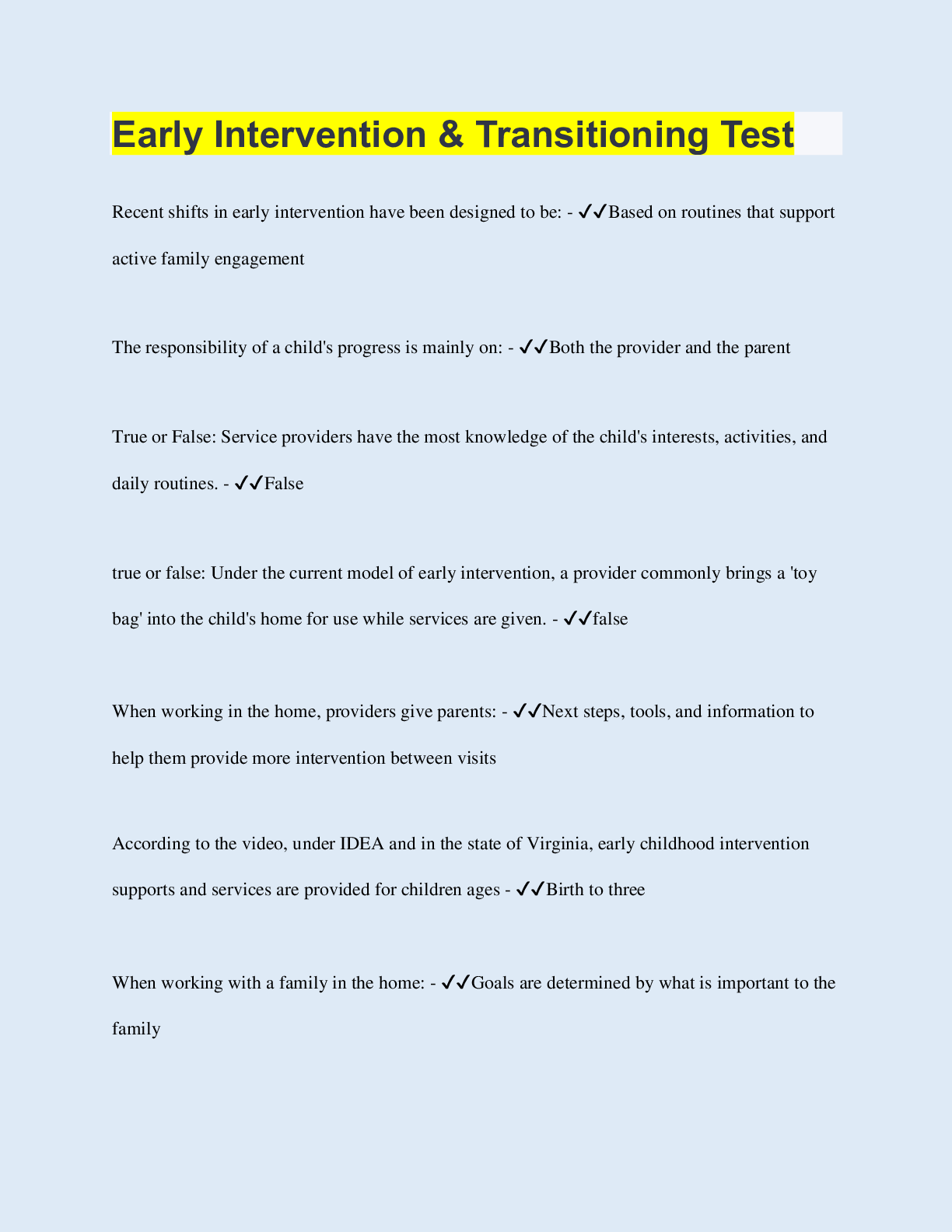 Social Sciences > QUESTIONS & ANSWERS > Early Intervention & Transitioning Test (All)
