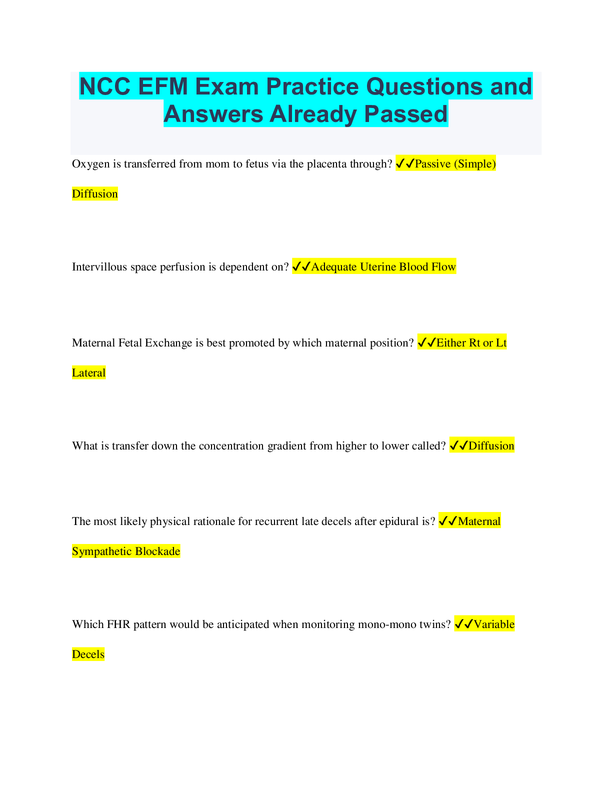 Social Sciences > QUESTIONS & ANSWERS > NCC Electronic Fetal Monitoring Certification Questions and Answers Already Graded A (All)