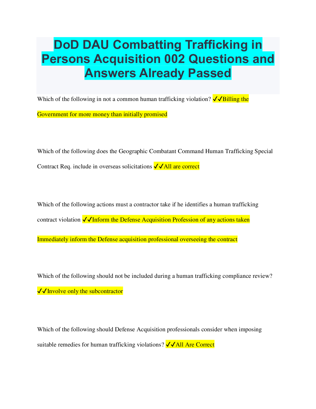 Social Sciences > QUESTIONS & ANSWERS > DoD DAU Combatting Trafficking in Persons Acquisition 002 Questions and Answers Already Passed (All)