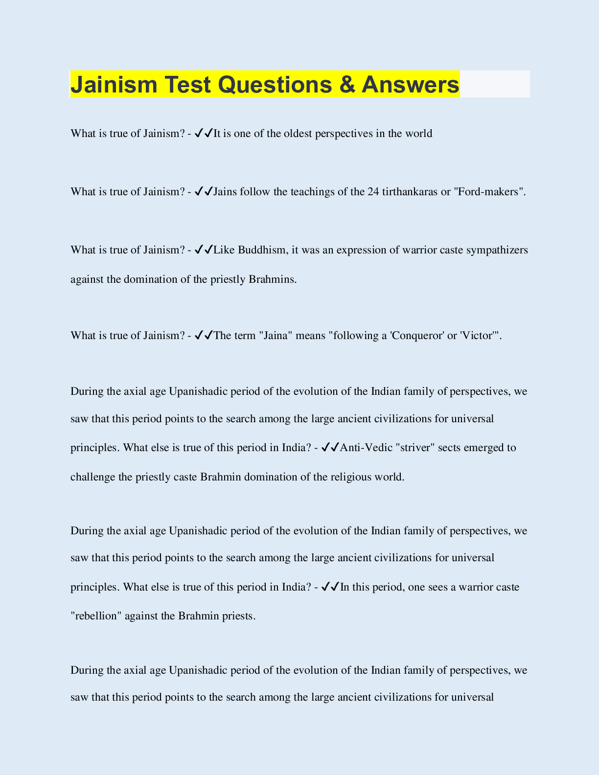 Social Sciences > QUESTIONS & ANSWERS > Jainism Test Questions & Answers (All)