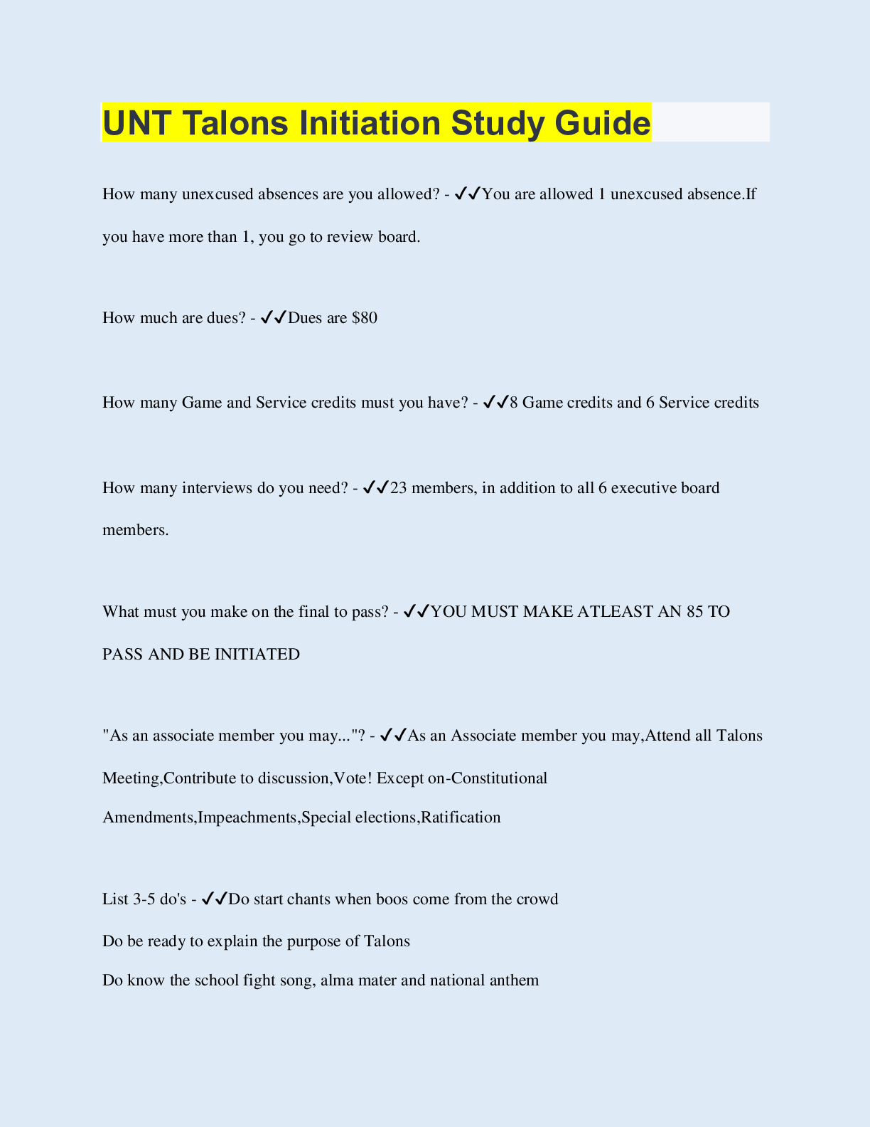 Social Sciences > QUESTIONS & ANSWERS > UNT Talons Initiation Study Guide (All)