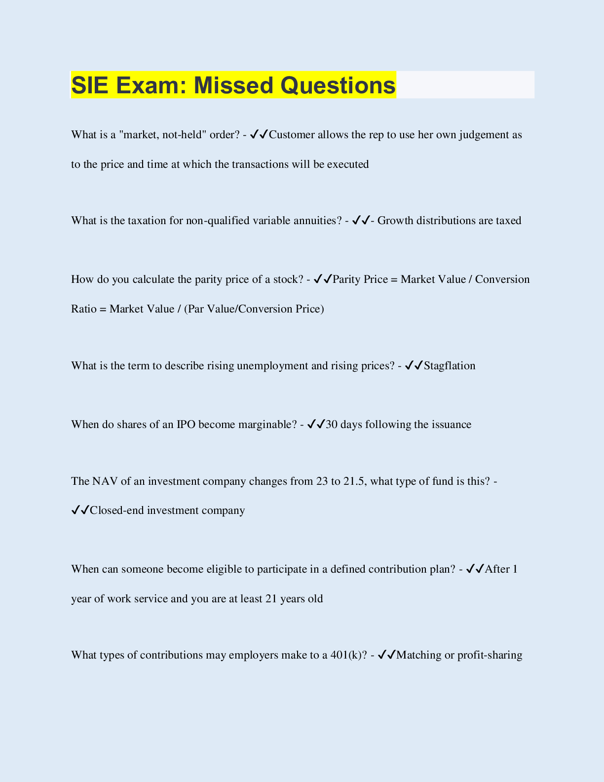Social Sciences > QUESTIONS & ANSWERS > SIE Exam: Missed Questions (All)