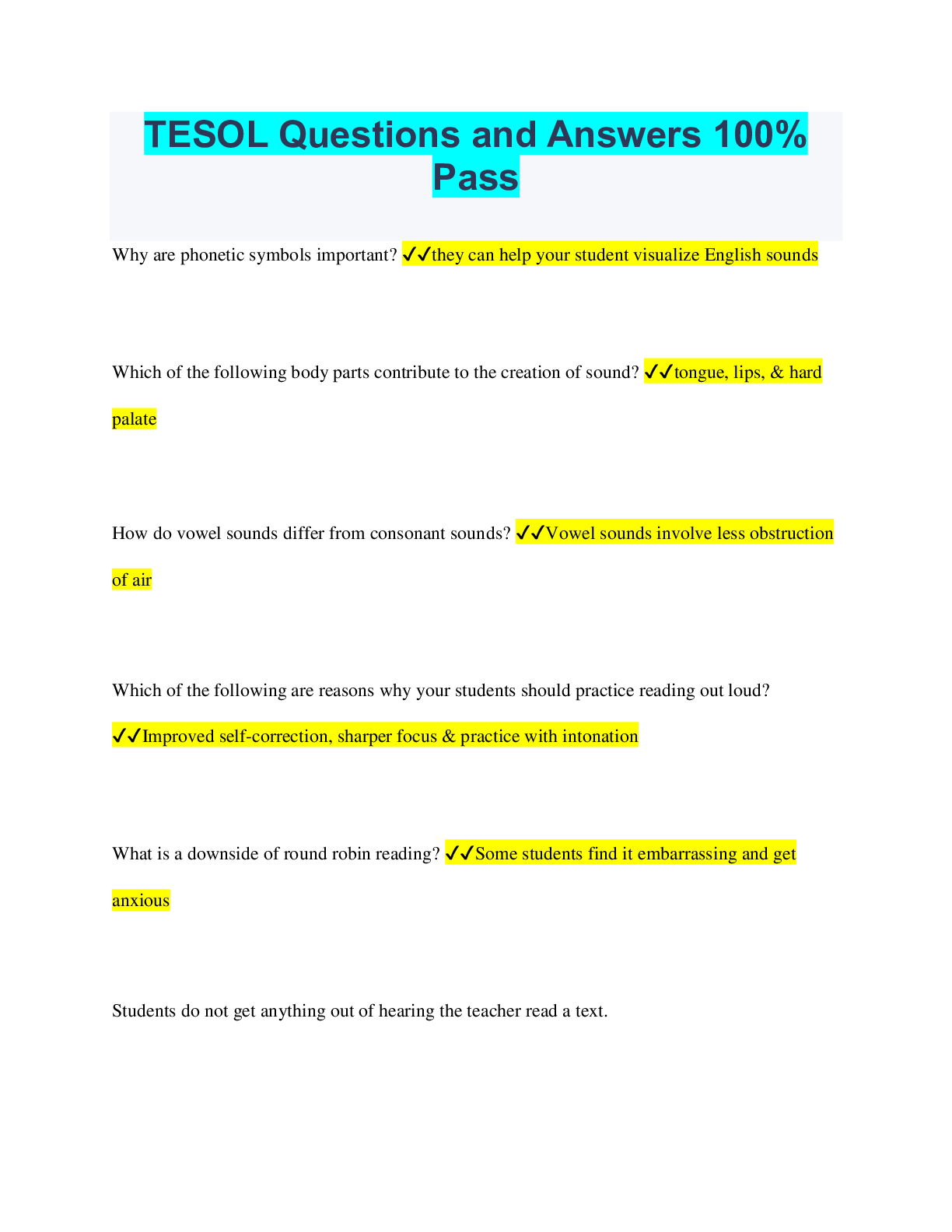 Social Sciences > QUESTIONS & ANSWERS > TESOL Questions and Answers 100% Pass (All)