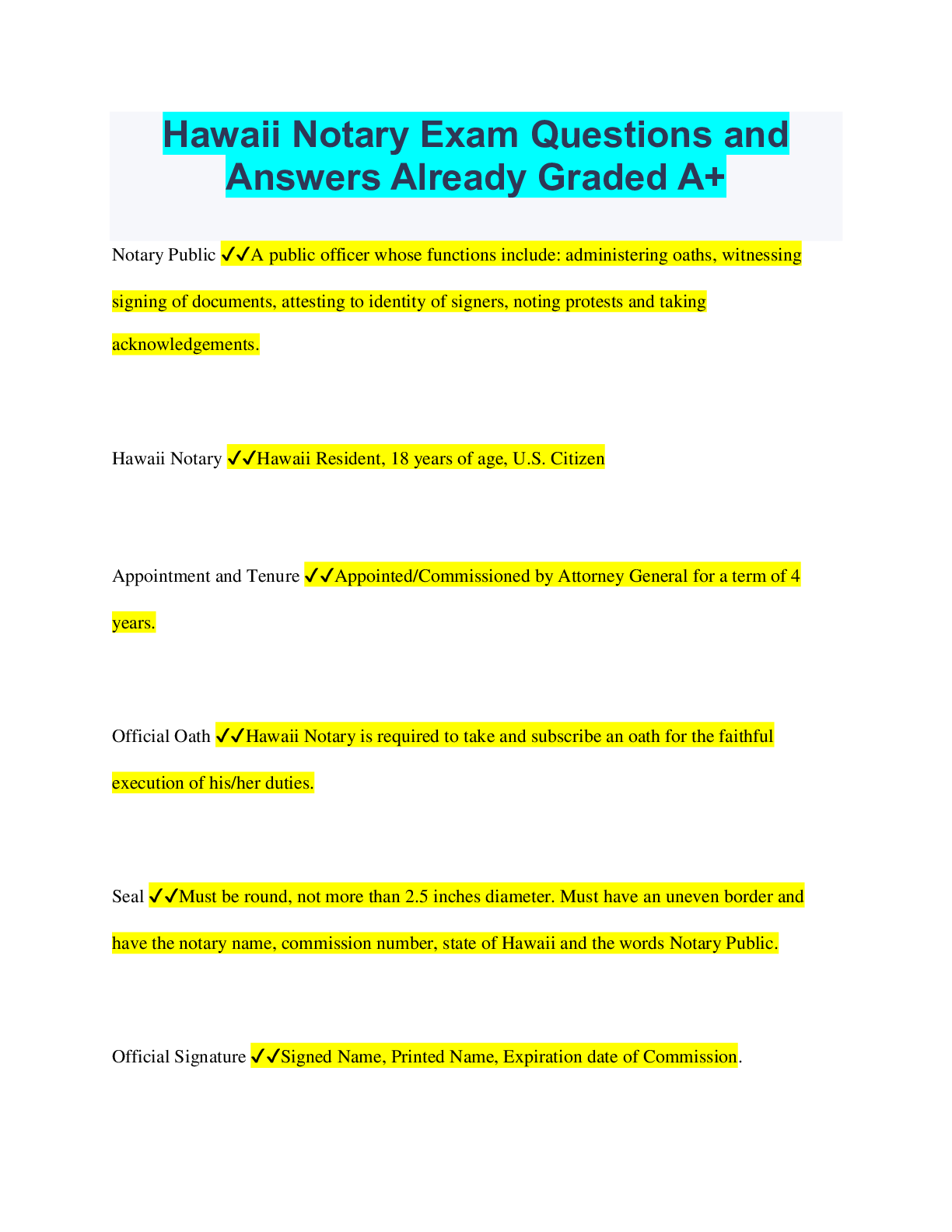 Social Sciences > QUESTIONS & ANSWERS > Hawaii Notary Exam Questions and Answers Already Graded A+ (All)