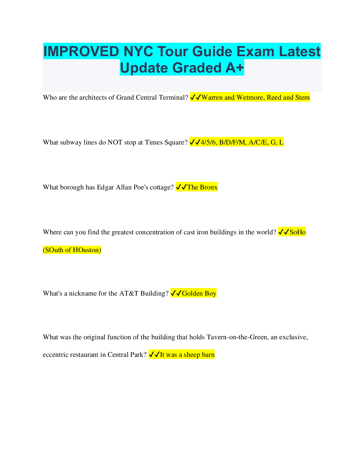 Social Sciences > QUESTIONS & ANSWERS > IMPROVED NYC Tour Guide Exam Latest Update Graded A+ (All)