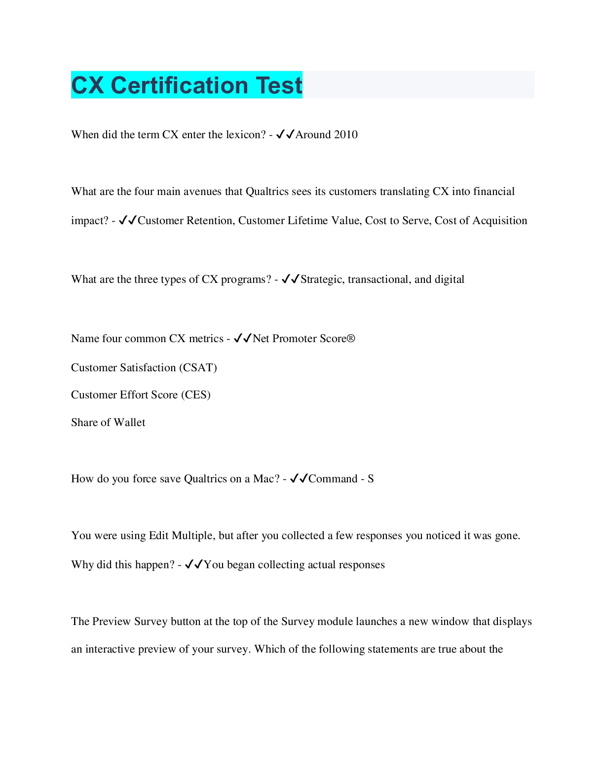 Social Sciences > QUESTIONS & ANSWERS > CX Certification Test (All)