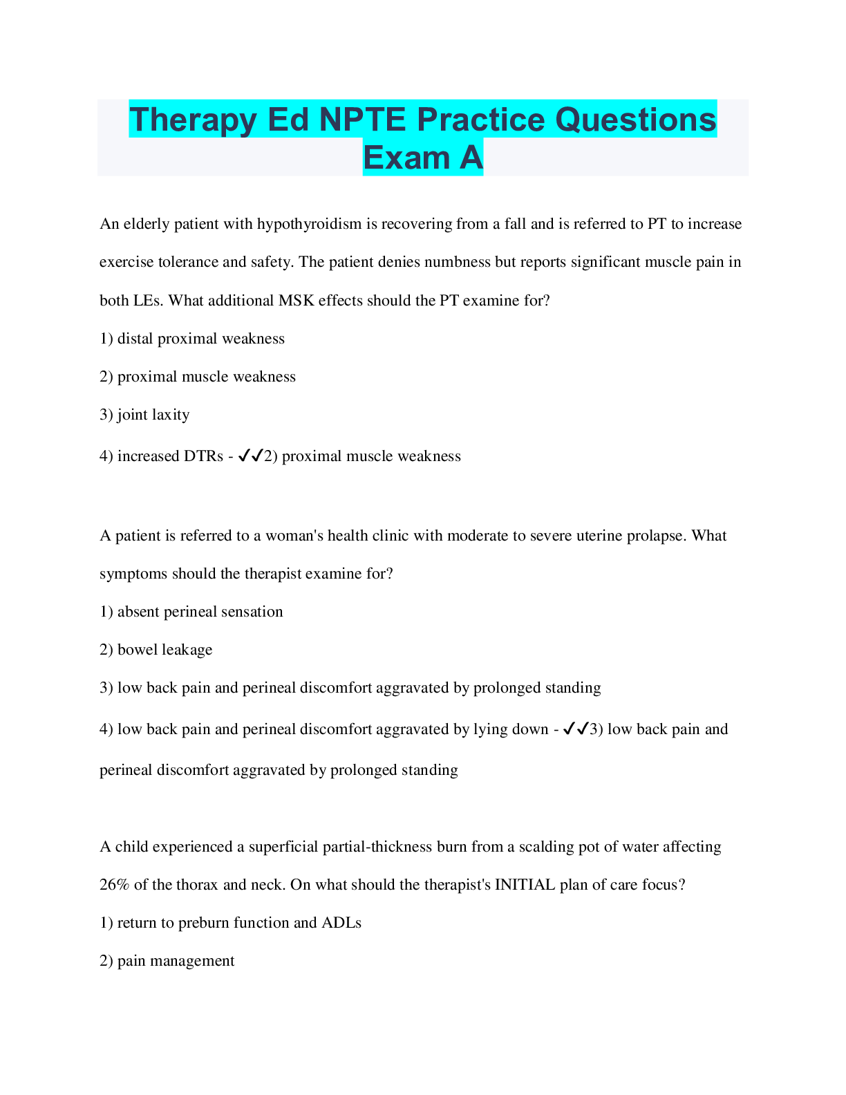 Social Sciences > QUESTIONS & ANSWERS > Therapy Ed NPTE Practice Questions Exam A (All)