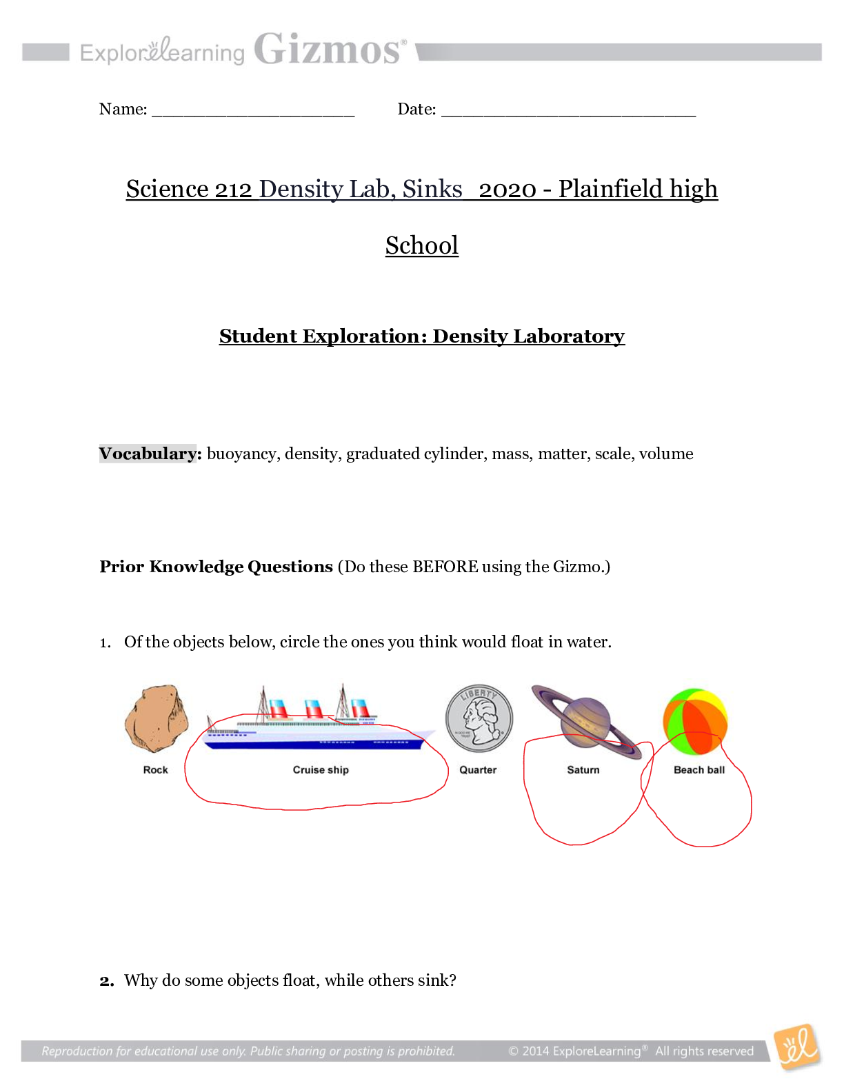 Social Sciences > EXAM > Science 212 Density Lab, Sinks_2020 - Plainfield high School | Science212 Density Lab, Sinks_2020 (All)