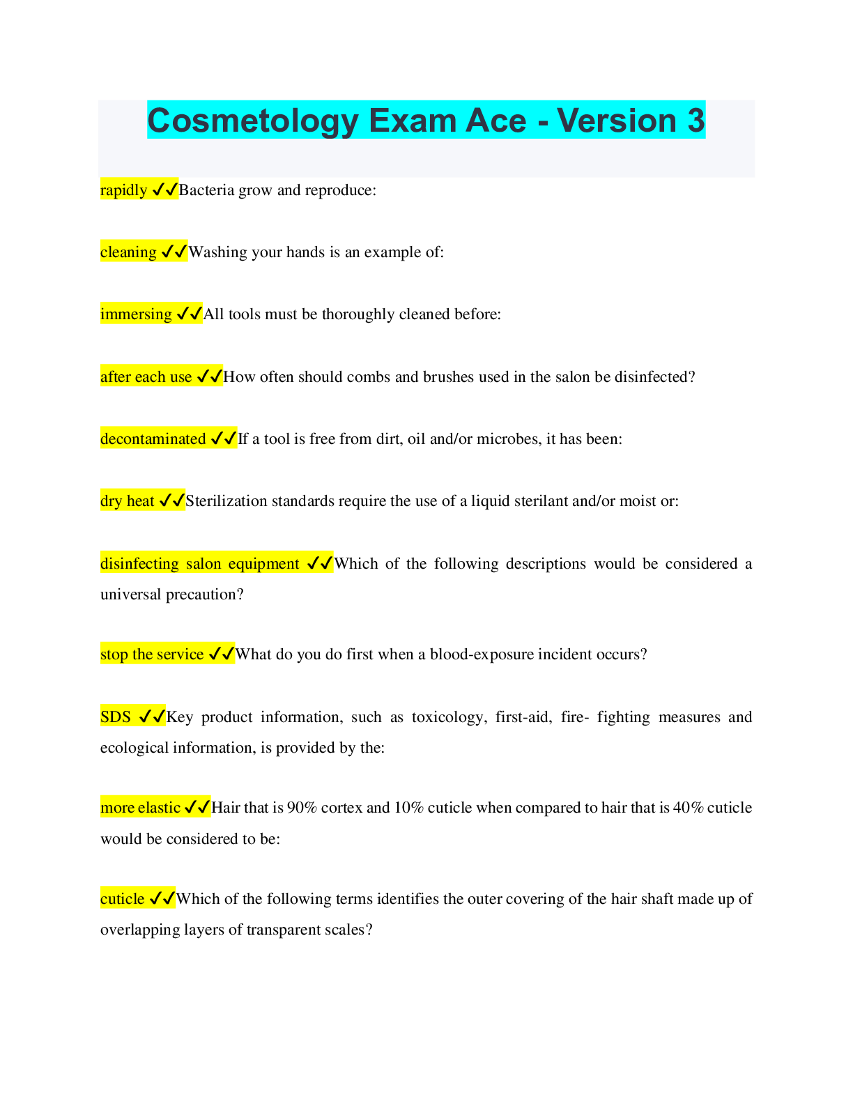 Social Sciences > EXAMs > Cosmetology practice exam 1 questions and answers rated A (All)