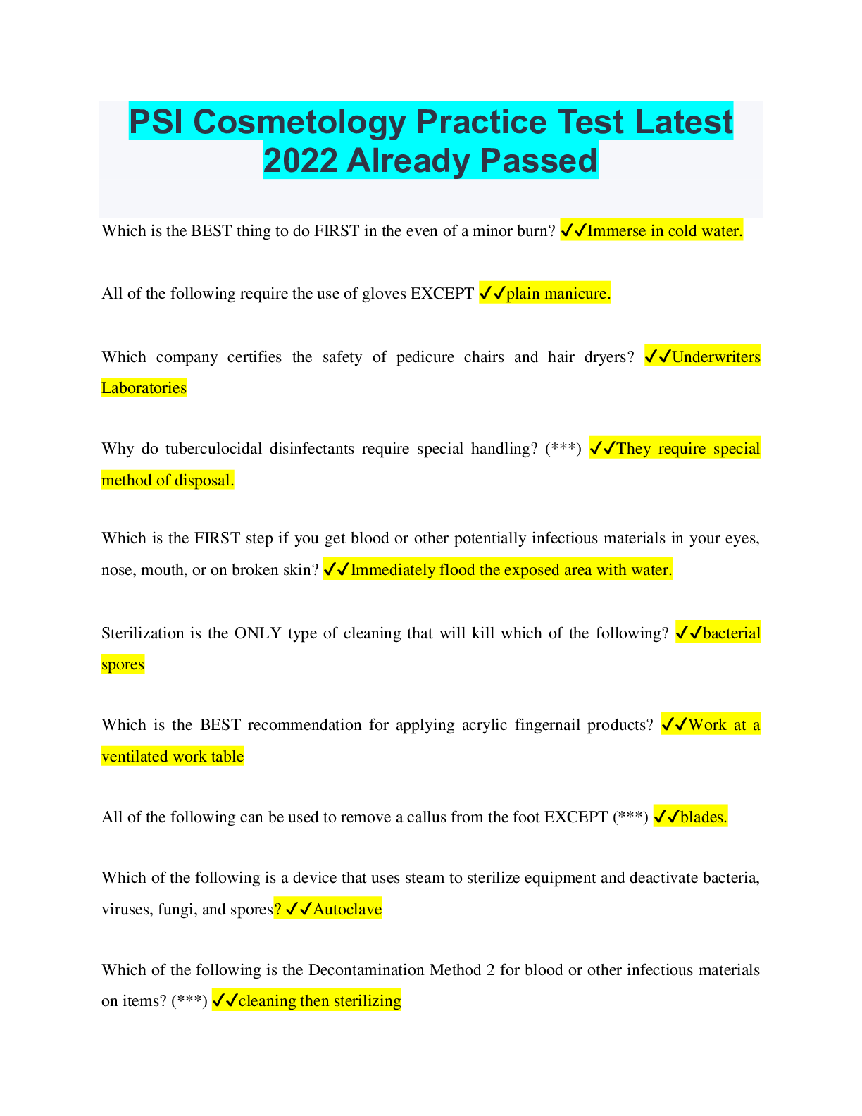 Social Sciences > EXAMs > PSI Cosmetology Theory Exam Latest 2022 Graded A (All)