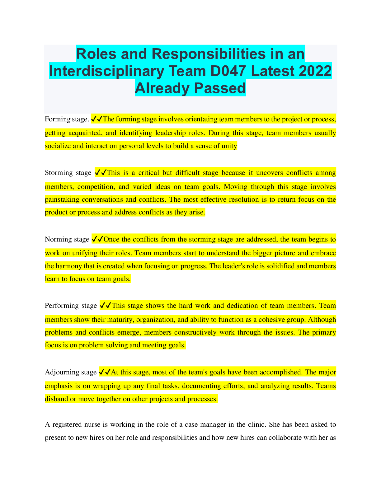Social Sciences > QUESTIONS & ANSWERS > Roles and Responsibilities in an Interdisciplinary Team D047 Latest 2022 Already Passed (All)