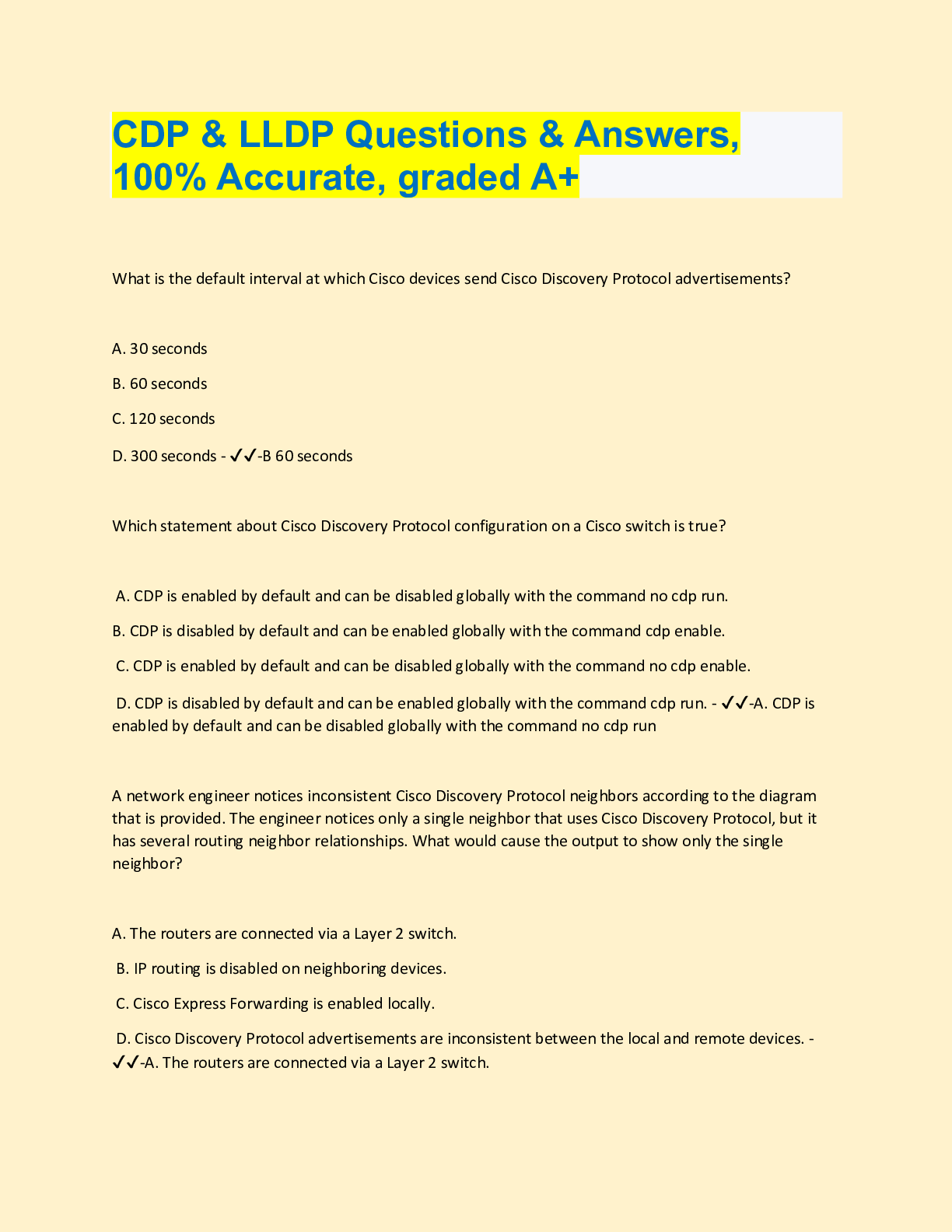 Social Sciences > QUESTIONS & ANSWERS > CDP & LLDP Questions & Answers, 100% Accurate, graded A+ (All)